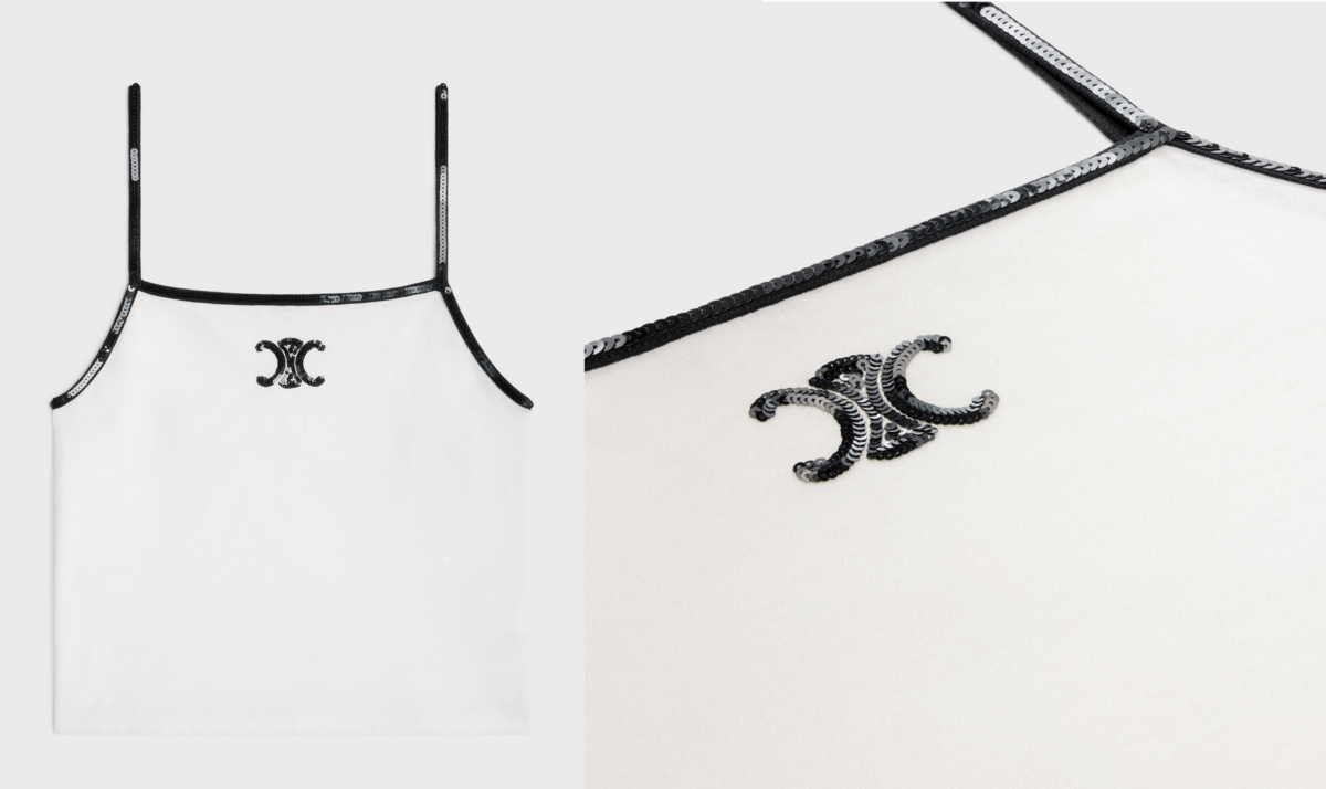 CELINE新款的吊帶背心也是大熱之選,以白色搭配黑色小亮片為主,除了在肩帶及領口邊點綴,中間還有一個黑色亮片刺繡製成的TRIOMPHE LOGO,低調又精緻!像Newjeans的Danielle搭配牛仔外套和長褲,加上高馬尾,展現出俏皮可愛的一面~連《淚之女王》的金智媛也有同一件小背心,馬上Get同款吧!