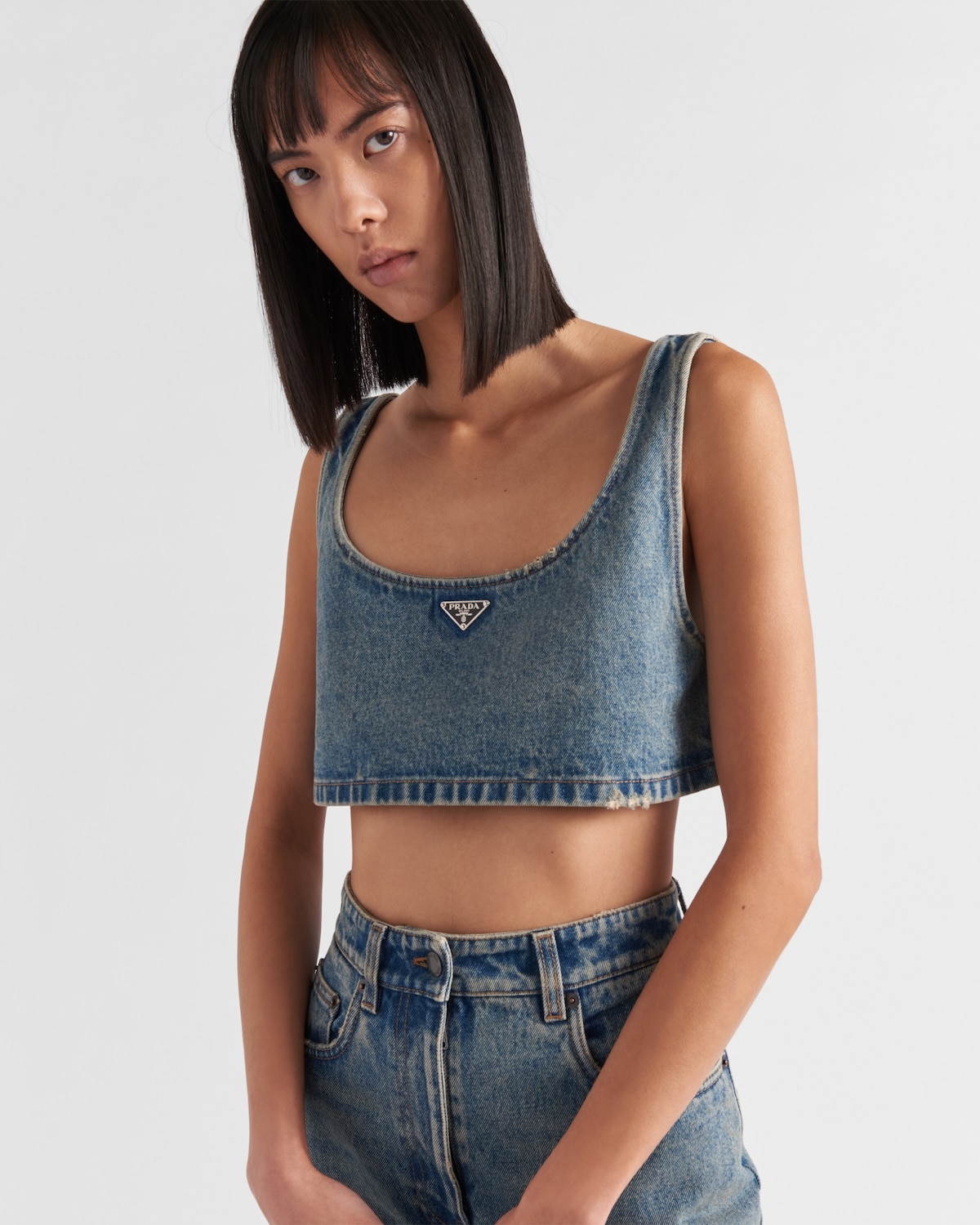 這款Prada的洗水牛仔背心,給人一種仿舊的復古效果,短版及方正剪裁能夠露出鎖骨和腰線,再採用對比色明線,當然中間位置還有Prada具代表性的搪瓷金屬三角標誌,十分好看!不論是單穿還是疊穿都時尚感十足~