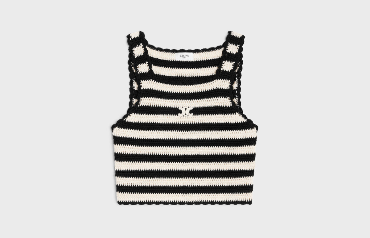 另一款CELINE鉤花棉質的短款背心同樣夏日感滿滿~以黑白鉤花橫間設計加上微微的花邊,中間低調地有一個CELINE經典的鉤花TRIOMPHE刺繡Logo,特別又充滿少女感!