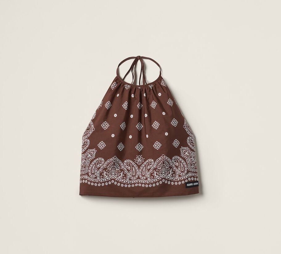 這件啡色的府綢掛頸式背心,以經典方巾印花風格為靈感,後面綁有一個蝴蝶結,清涼又不失小性感~短版設計大露腰線,下擺也不忘針織miumiu標誌作點綴!miumiu代言人張員瑛也有穿,搭配草編包充滿夏日度假的氛圍~