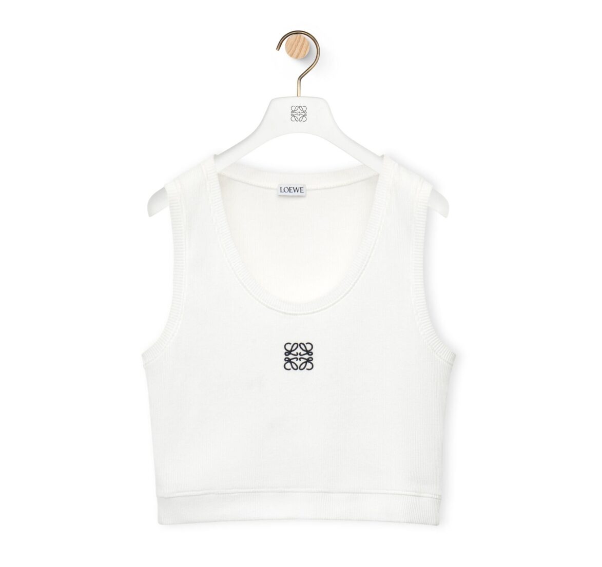 除了掛頸背心,基本款也是值得入手!這款LOEWE短版背心,中間繡有品牌的「Anagram」圖案,低調百搭又能夠拉長比例~加上羅紋設計,更顯質感!不論是白色配深藍色Logo還是黑色配白色Logo都很好看~