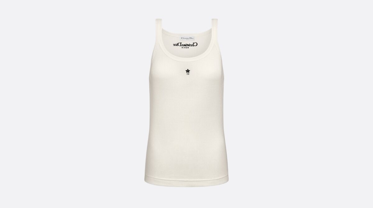 這款背心是 Dioriviera 限定系列的設計之一,以米白色純棉棱紋平織布製造,簡約的設計相當百搭,正面以Dior先生的幸運星圖案和 CD 標誌作點綴,背面亦繡有 Christian Dior的標誌,以刺繡方式呈現十分有質感!而Newjeans的Haerin身上正正就是這款背心,修身之餘展現出好看的肩頸線條~