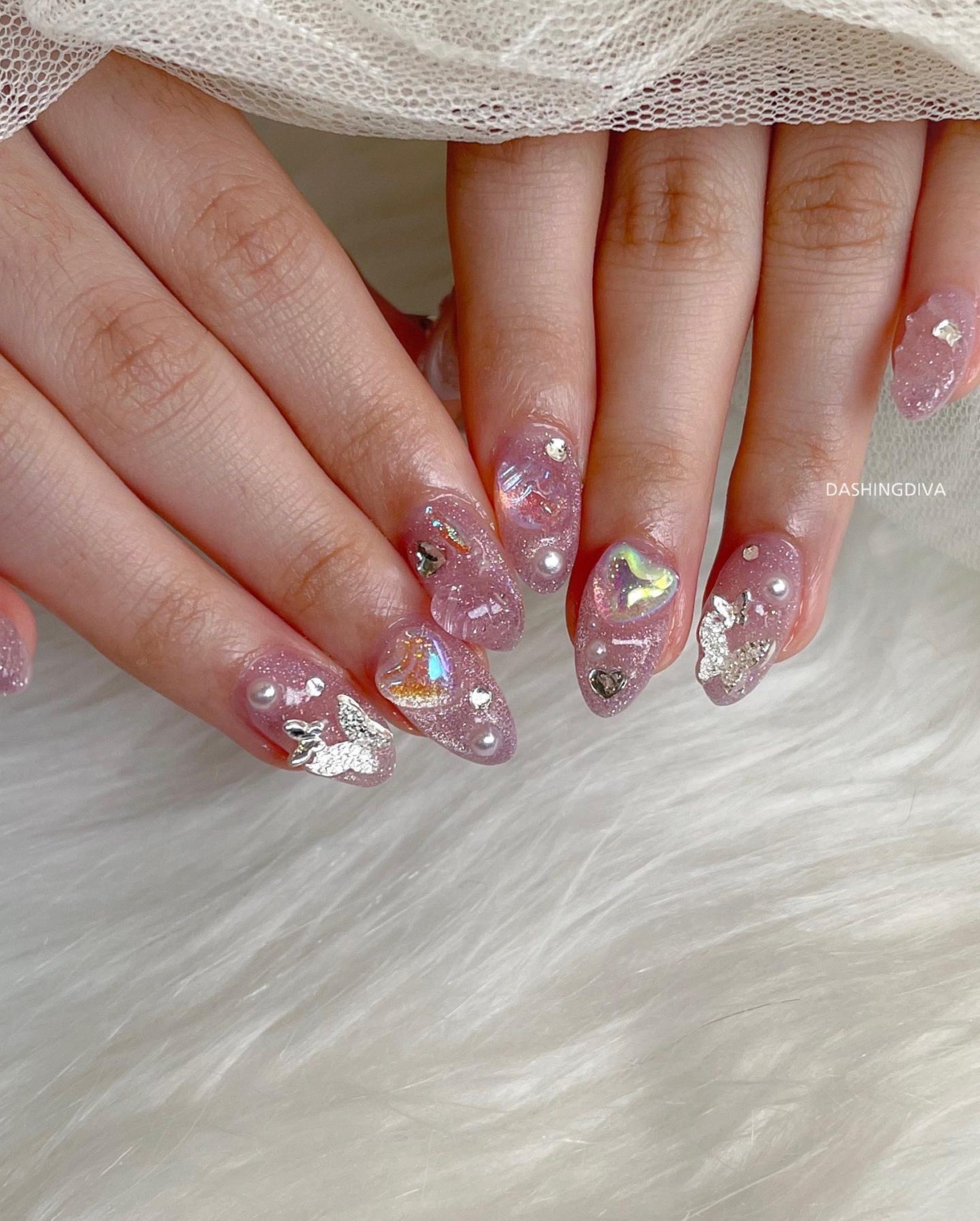 相信大部分的女生都曾經有過公主夢,IVE成員Rei的這套美甲就最適合大家啦!可見她用了透粉色貓眼再配上不同款式的立體愛心、小珍珠及銀色蝴蝶裝飾,甜美之餘又充滿立體感!