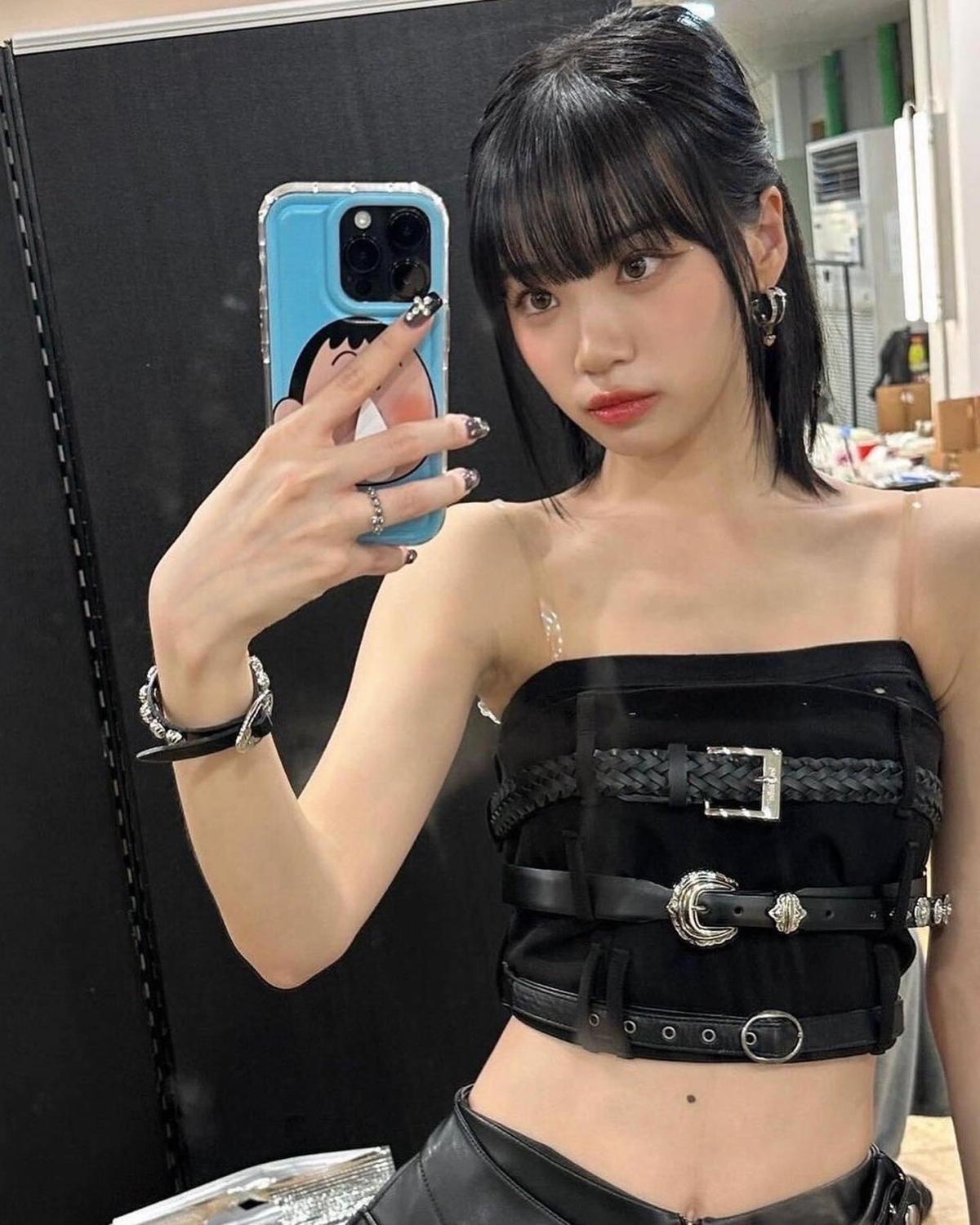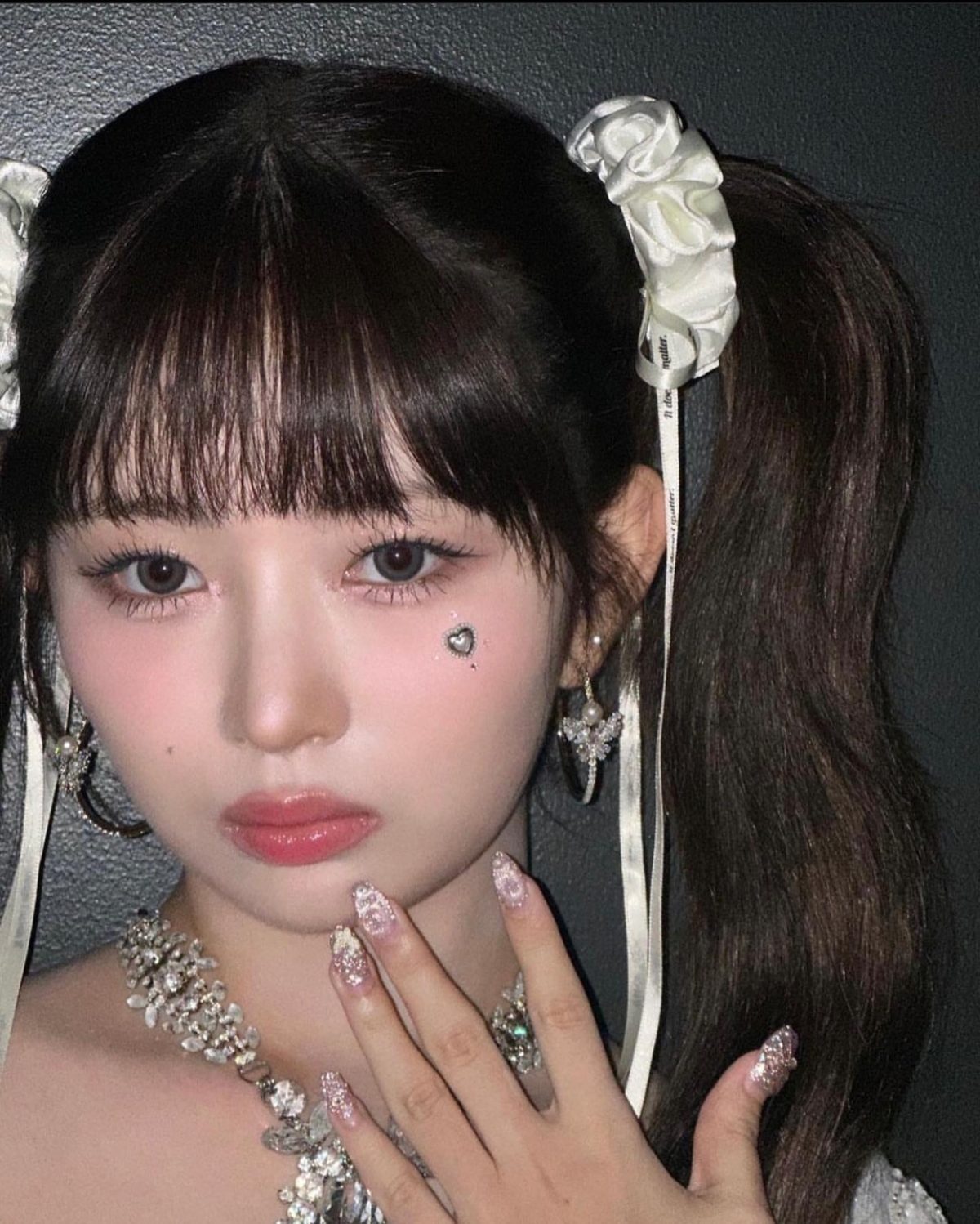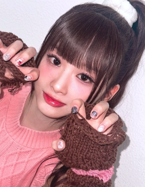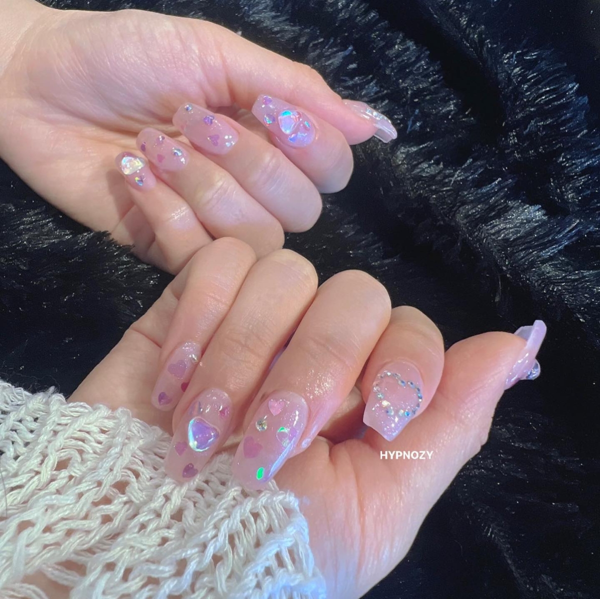 喜歡粉紅色的女生,可以參考一下NMIXX成員海嫄的一款美甲,這個款式以透明感十足的粉色做底色,然後貼上愛心閃石、閃片等等,看上來感覺超可愛!