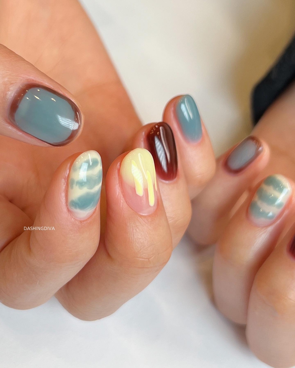 喜歡日系風格的女生,可以參與一下Red Velvet成員Seulgi的美甲,這個款式用低飽和的顏色來打造整體氛圍,雖然每隻指甲的顏色不一樣,但合起來意外地好看!小編特別喜歡以暈染的方式在米白色的底色畫上藍色的橫線,不會有生硬的感覺。