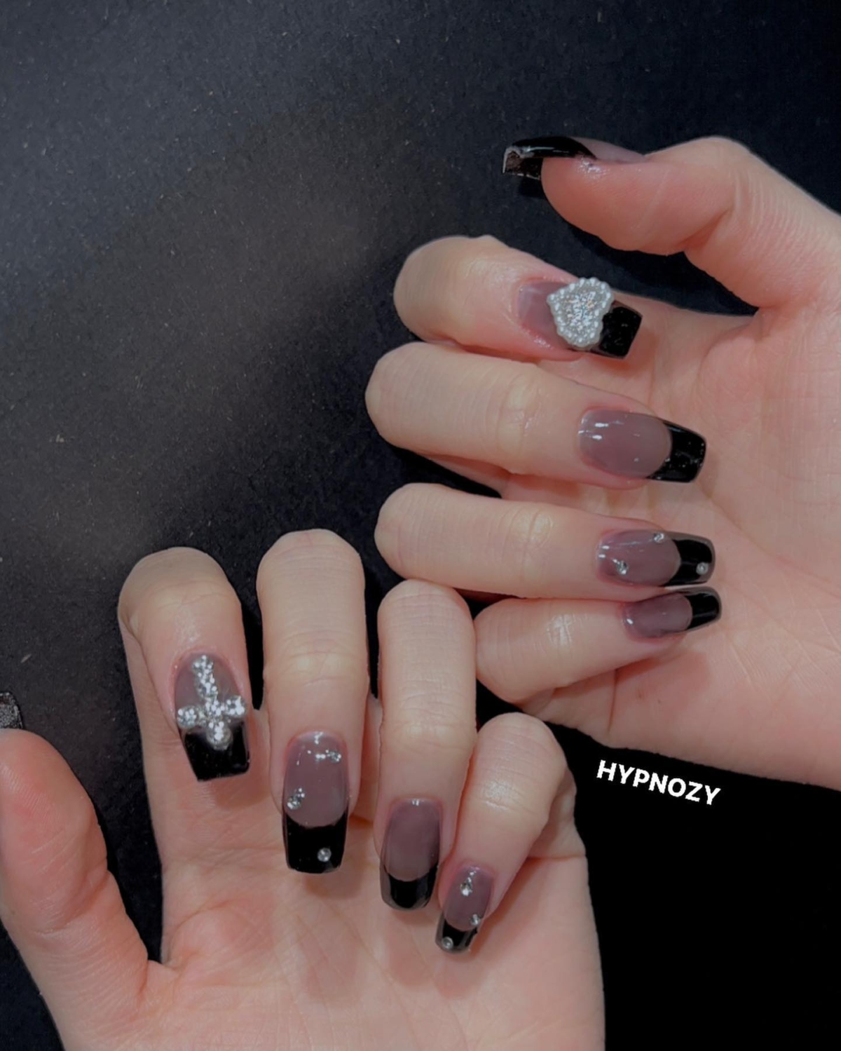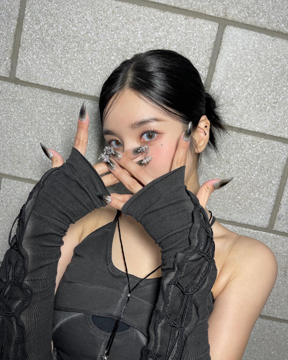 日常打扮以型格風為主的女生,可以參考一下女團LE SSERAFIM 成員采源的美甲,這個款式是用灰色X黑色的配搭,之後在甲面貼上細閃石作點綴,其中的2隻手指則用閃石及珍珠貼出比較誇張的十字架和愛心圖案,令指甲款式不會太單調!
