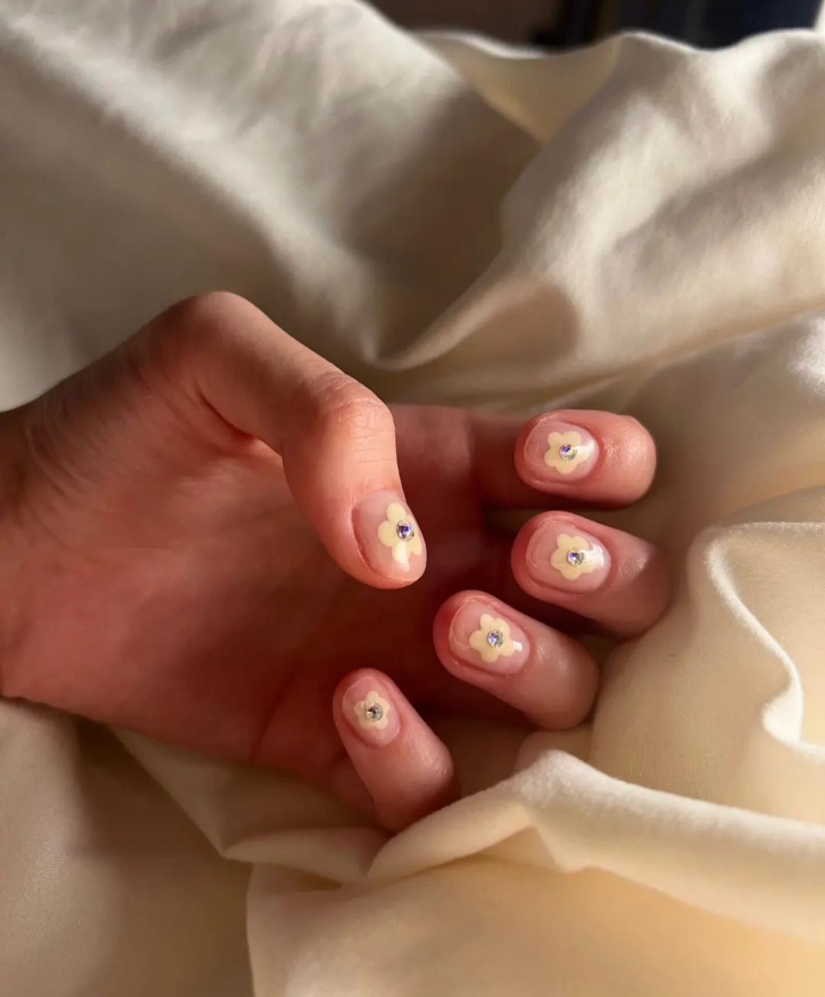 LE SSERAFIM 成員恩採擁有甜美的外型,她的美甲款式同樣走清新甜美風格,以基本的透粉色做底色,再在每隻手指畫上黃色小花,最特別之處是在花花的中間加上閃石,平日的穿搭偏少女及可愛風的女生可以參考一下~