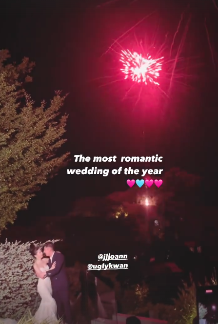 關楚耀在台上爆喊向老婆宣讀愛的宣言:「喺未來嘅日子,請你繼續愛我、提點我,我承諾,我會保護你一生一世。多謝外父外母生咗Joann咁聰明、咁孝順嘅女仔。多謝我爹哋、媽咪,同埋妹妹,經常都容忍我,遷就我;多謝妹夫、妹夫屋企人咁照顧我哋。」太太Joann聽完也感動落淚。晚上更準備了煙火表演,非常浪漫!