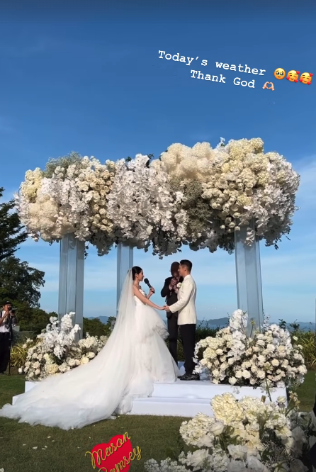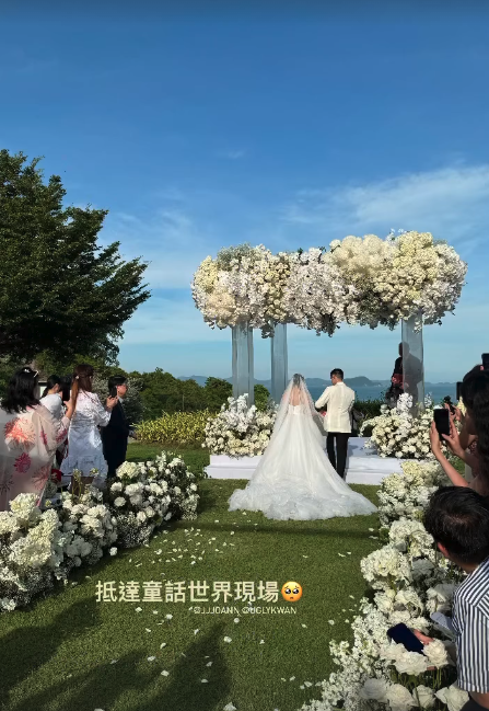 翌日關楚耀跟足傳統接新娘,之後在戶外草地行禮,賓客席兩旁及主婚台都放滿白色鮮花,加上天公造美,一對新人在一眾摰愛親友和藍天白雲見證下結為夫婦,看上去有如置身童話世界一樣。