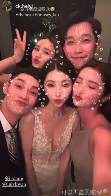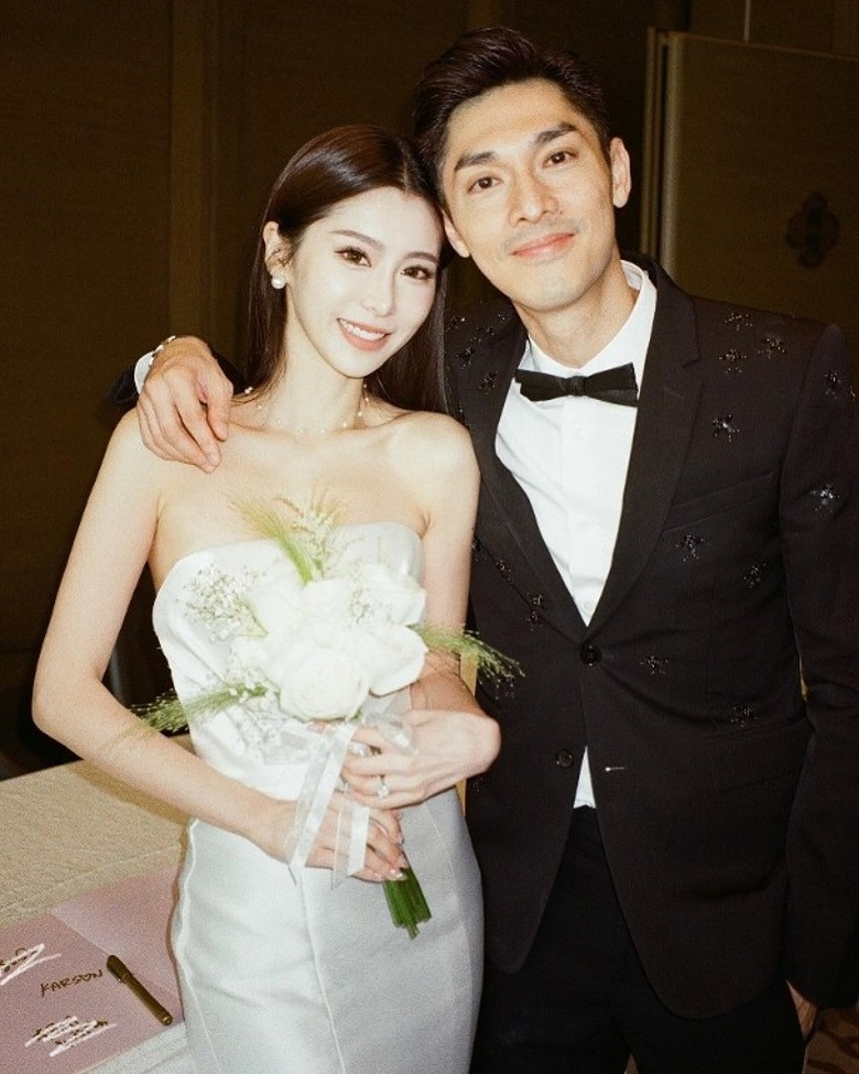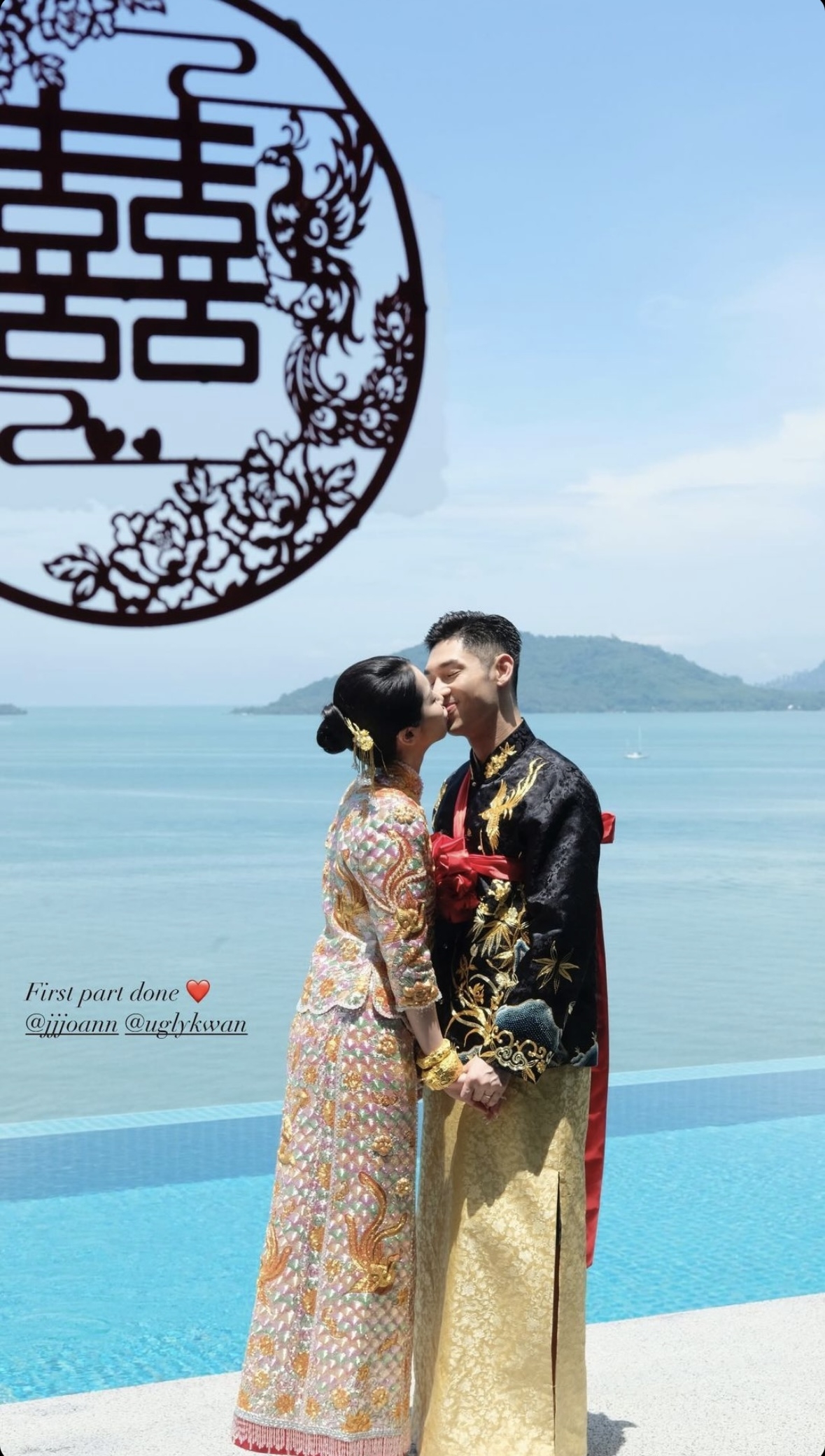 去年11月關楚耀在IG上傳了幾張婚照宣布正式成為關生及關太,不少圈中好友都有在社交平台留言祝賀一對新人。當時關楚耀老婆Joann穿上低胸婚紗,手上的巨鑽婚戒更是搶眼。另外Joann穿著紅色晚裝,身上的18隻龍鳳鈪,同樣吸睛!