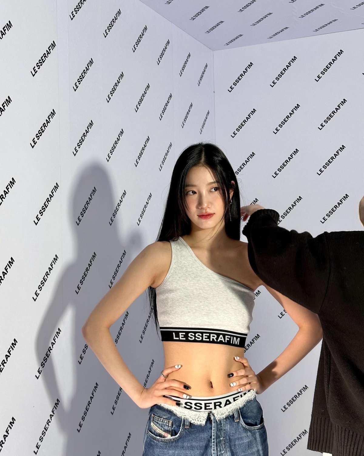 反摺牛仔褲+Logo內褲是最常見的穿搭公式之一,女團LE SSERAFIM成員Kazuha擁有結實的腹肌,她上身穿著Bra Top,下身就以牛仔褲+內褲配搭,簡簡單單已經很好看,記得要將牛仔褲褲頭輕輕反摺,就可以更加突出Logo內褲!