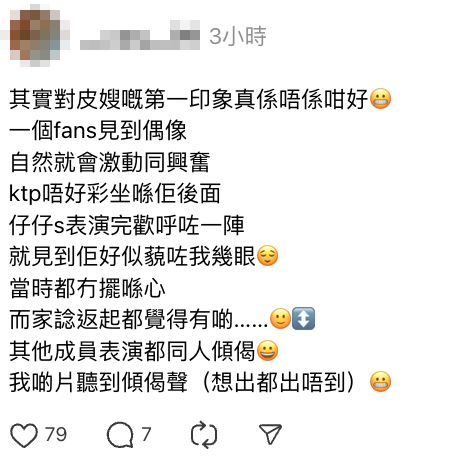 不過在皮嫂現身社交平台後,突然有網友在社交平台發文,直言對皮嫂的第一印象不太好,當中有粉絲爆料稱自己曾經在《Katch The Pop》音樂會疑似坐在皮嫂後面的座位「一個fans見到偶像自然就會激動同興奮!ktp唔好彩坐喺佢後面,仔仔s表演完歡呼咗一陣,就見到佢好似藐咗我幾眼!當時都冇擺喺心,而家諗返起都覺得有啲……」網友又指皮嫂在其他成員表演的時候,只顧與身邊的人聊天,導致她的影片全錄到聊天的聲音,不過亦有網友質疑樓主為什麼會知道是皮嫂本人!