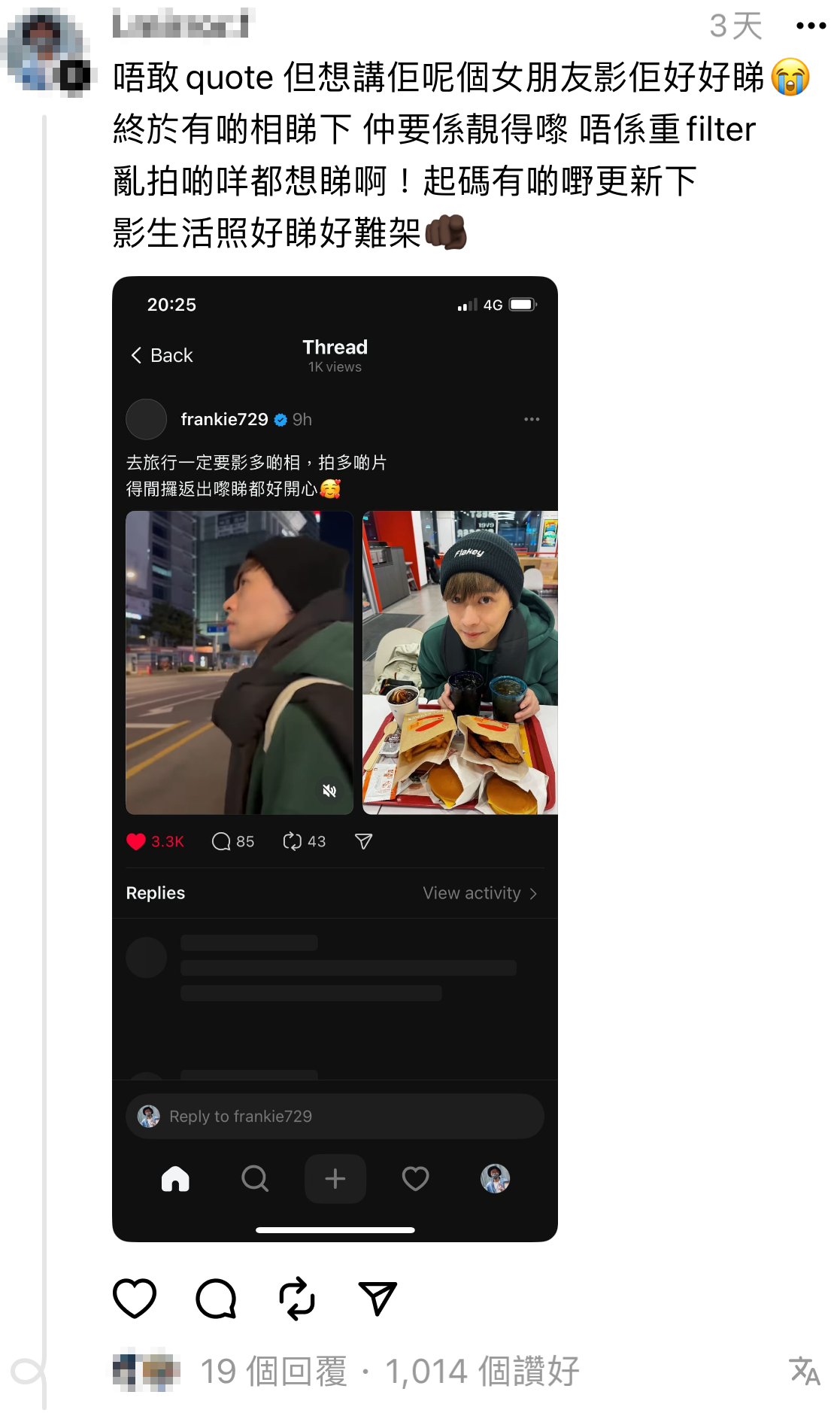 日前Frankie在社交平台晒出多張在韓國旅行的照片,由於照片大多都是女友視覺,因此不少網友都大讚皮嫂的拍攝技術,甚至有粉絲出post寫道:「想講佢呢個女朋友影佢好好睇,終於有啲相睇下,仲要係靚得嚟,唔係重filter,亂拍啲咩都想睇啊!」又稱拍生活照好看亦有難度!