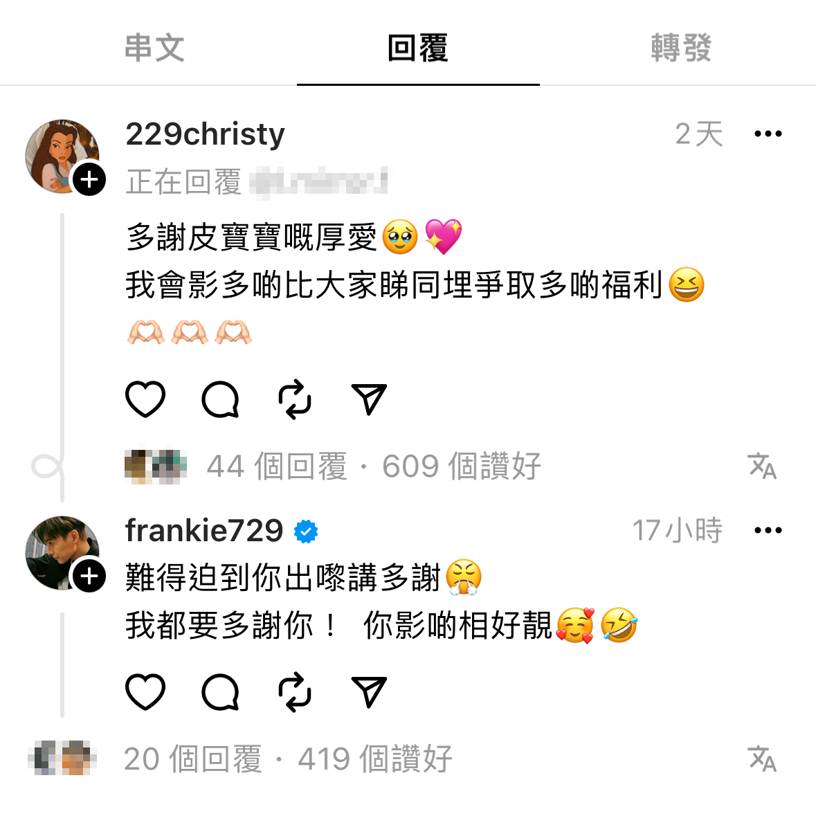 結果貼文引出皮嫂親自回覆網民:「多謝皮寶寶嘅厚愛!我會影多啲比大家睇同埋爭取多啲福利」,首度現身回覆Fans都令人好驚喜,當中連Frankie都有回覆女友:「難得迫到你出嚟講多謝!我都要多謝你! 你影啲相好靚」,公開放閃好sweet!