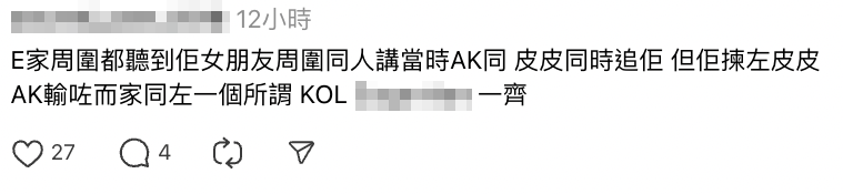 另外亦有網友爆料,稱隊友AK疑似與KOL拍拖「聽到佢女朋友周圍同人講當時AK同皮皮同時追佢,但佢揀左皮皮,AK輸咗而家同左一個所謂 KOL一齊」雖然爆料未經證實,但已經引來不少網友的熱議!不過亦有粉絲認為偶像拍拖是他們的私生活,不影響到工作就可以!