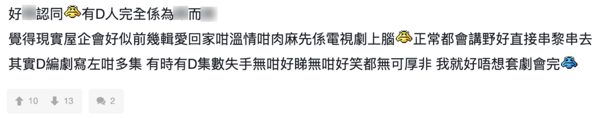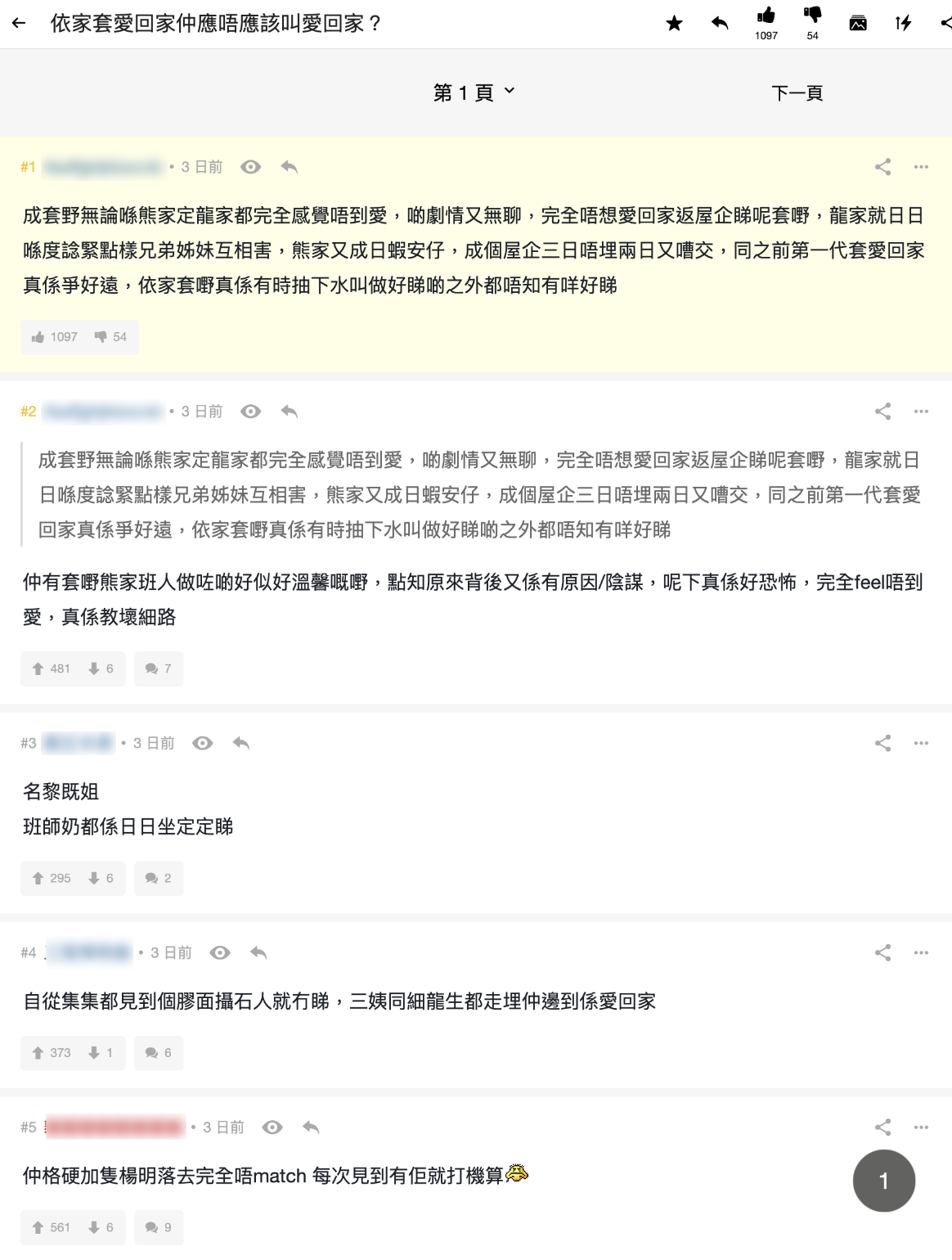 近日有網民在討論區上發佈了一篇關於TVB劇集《愛回家》劇情的貼文,該網民表示現在的《愛回家》大不如前!劇情幼稚無聊,龍家兄弟姊妹之間只剩下互相傷害,而熊家又只剩下欺負安仔。整部劇已經完全感受不到愛:「成套野無論喺熊家定龍家都完全感覺唔到愛,啲劇情又無聊,完全唔想愛回家返屋企睇呢套嘢」!