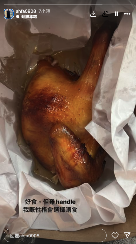 另外在Frankie爆出疑似出軌事件後,花姐的Story亦受到網友的關注,繼日前花姐上傳一張吃片皮鴨的照片後,昨晚又上傳了一張燒雞的照片並寫道:「好食,但難handle,我嘅性格會選擇唔食」令人耐人尋味的言論。