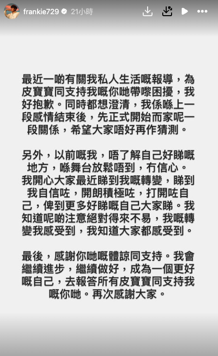 日前Frankie打破沉默在IG限時動態發文,「最近一啲有關我私人生活嘅報導,為皮寶寶同支持我嘅你哋帶嚟困擾,我好抱歉。同時都想澄清,我係喺上一段感情結束後,先正式開始而家呢一段關係,希望大家唔好再作猜測。」否認自己出軌,又提到:「以前嘅我,唔了解自己好睇嘅地方,喺舞台放鬆唔到,冇信心。我開心大家最近睇到我嘅轉變,睇到我自信咗,開朗積極咗,打開咗自己,俾到更多好睇嘅自己大家睇。我知道呢啲注意絕對得來不易,我嘅轉變我感受到,我知道大家都感受到。感謝你哋嘅體諒同支持。我會繼續進步,繼續做好,成為一個更好嘅自己,去報答所有皮寶寶同支持我嘅你哋。再次感謝大家。」