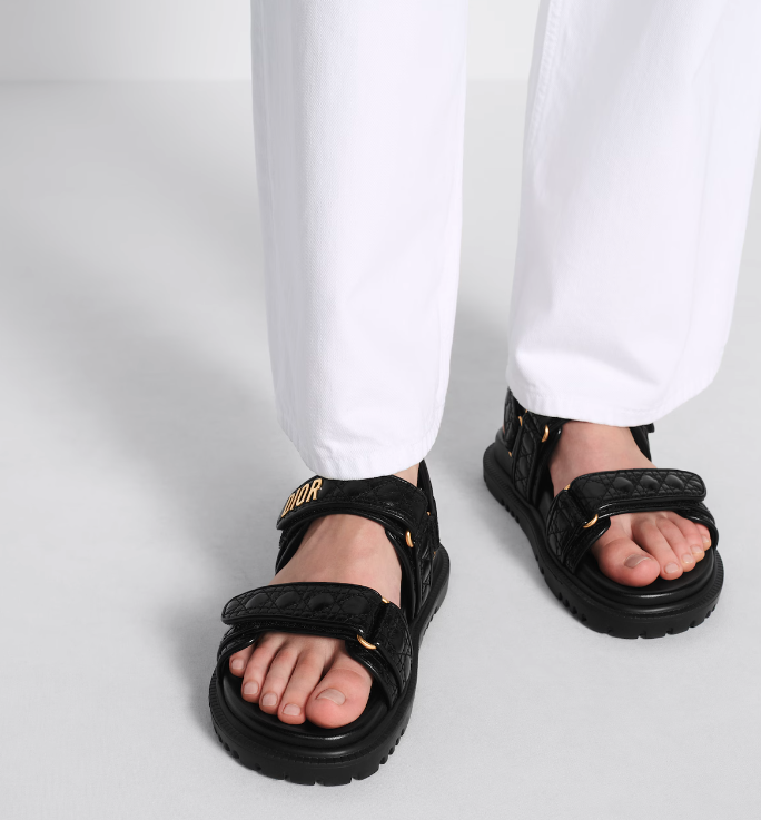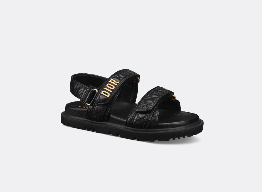 Dior Dioract涼鞋採用寬帶設計,搭配奢華的金屬細節,給人一種既休閒又高貴的感覺。而且黑色絎縫 Cannage 藤格紋圖案小牛皮,鞋面搭帶綴以金色飾面金屬Dior標誌低調又吸睛。