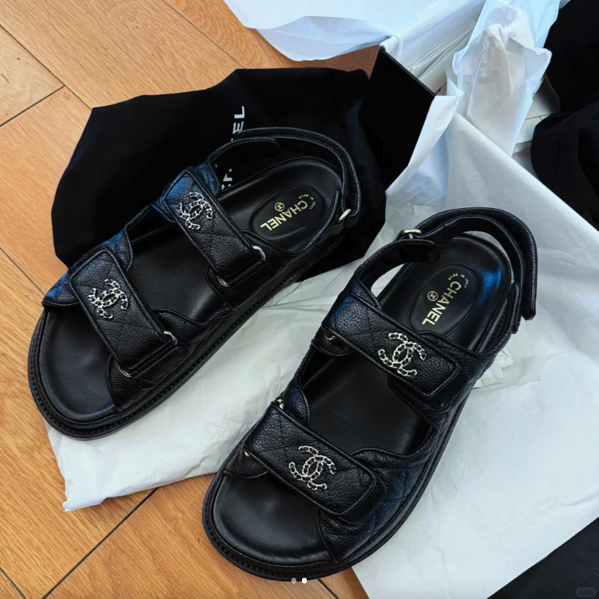 Chanel的魔術貼涼鞋以其經典的雙C標誌和時尚的魔術貼設計而聞名,而且兼具舒適與風格,適合各種場合。今季的魔術貼涼鞋採用牛皮製成,再搭配Chanel的皮穿鏈CC Logo,黑色涼鞋百搭又不怕過時。