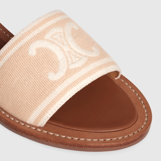 CELINE的LYMPIA涼鞋結合了緹花標誌印花和牛皮革,展現出品牌獨特的高端工藝和設計美學,杏色配以黃褐色,非常適合夏天的度假風。