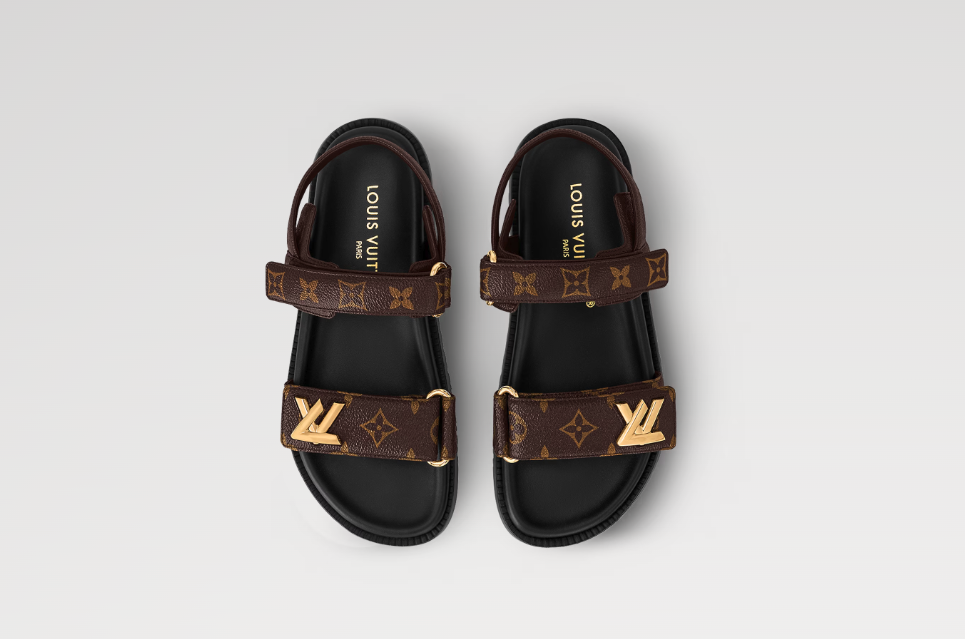 Louis Vuitton的 Sunset涼鞋以其簡約大方的設計和標誌性的LV花紋圖案而廣受歡迎,採用路易威登標誌性的Monogram帆布製作,以奢華的設計重新演繹舒適設計。