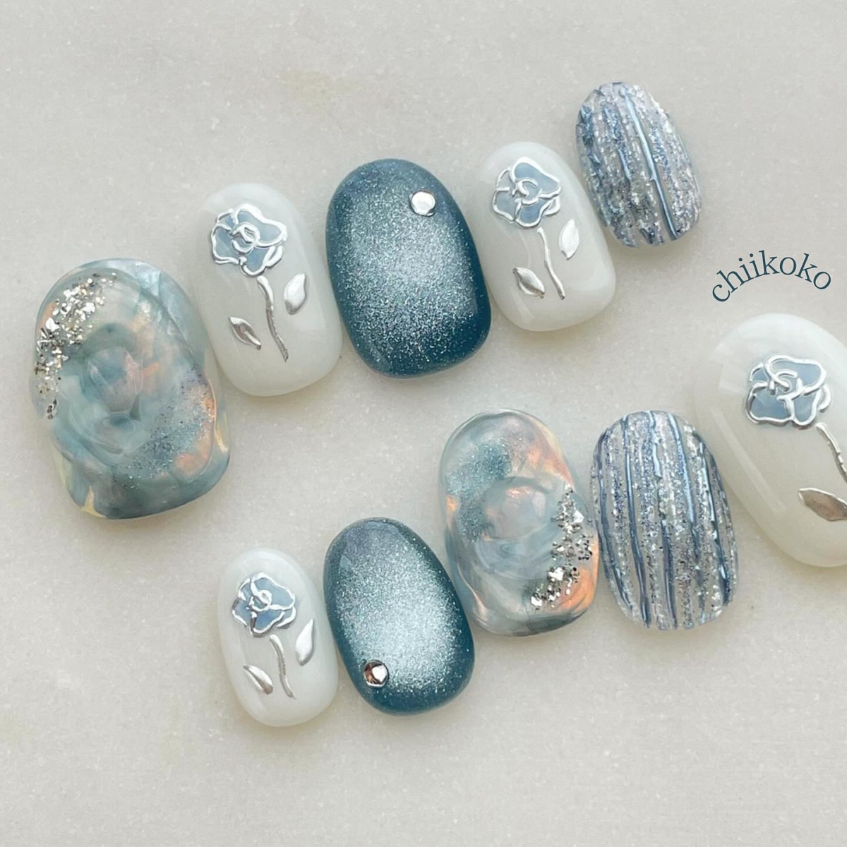 暈染款式的美甲可以說是不會過時的款式,這款美甲除了暈染、貓眼外,又用銀色的指甲油簡單畫出玫瑰模樣,非常有氣質!