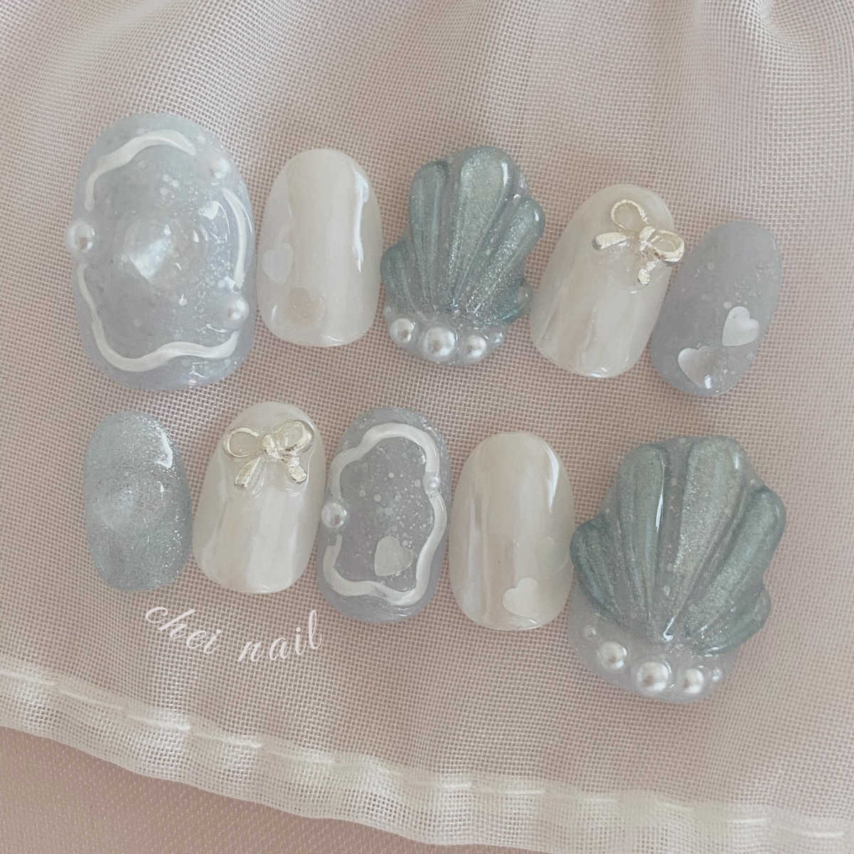 這款美甲用了立體貝殼、蝴蝶結及閃石來裝飾,當中最特別的是用白色邊來畫出生蠔模樣,充滿海洋感覺。
