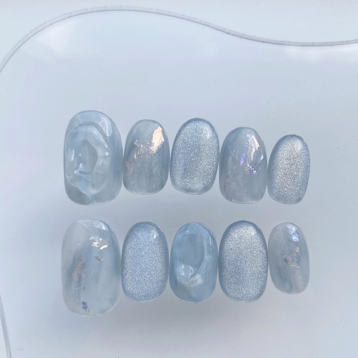 如果比較喜歡簡單美甲款式的女生,這款一定最適合你!貓眼美甲帶有透亮光澤,美甲師又在淺藍色的底色上加上少許暈染效果,簡單得來又不會太單調。