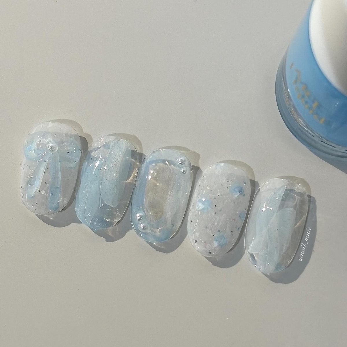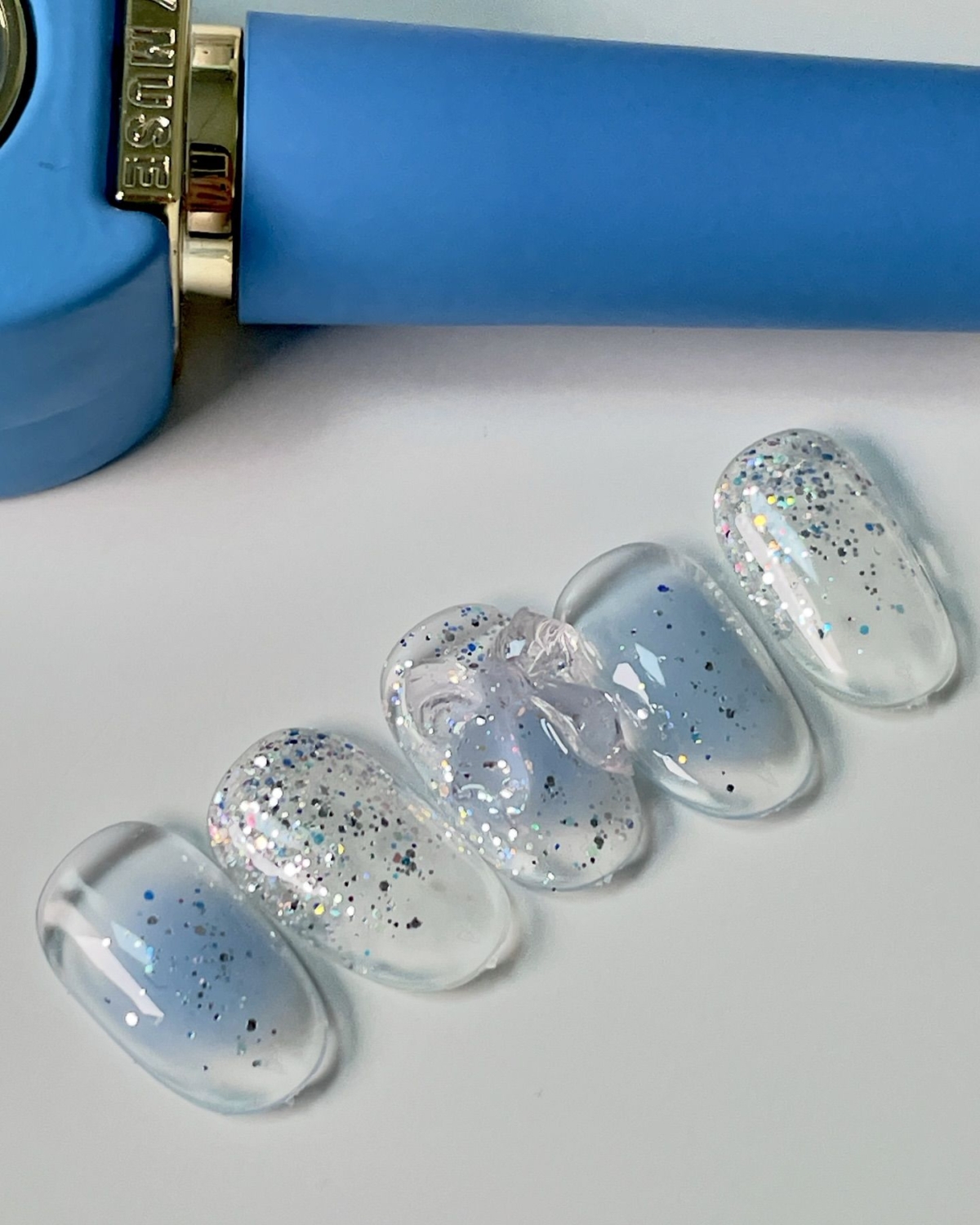 這款美甲先搽上透明底色,再在指甲中間位置加入粉藍胭脂暈染,最後用藍色閃粉紅點綴,在其中一隻指甲用一個大蝴蝶結裝飾。