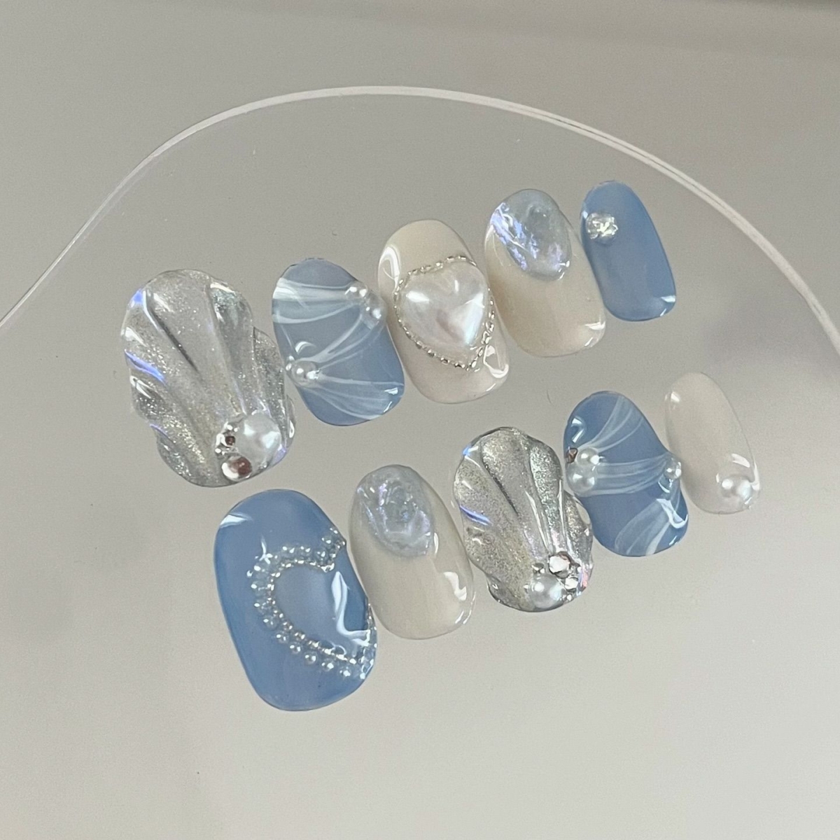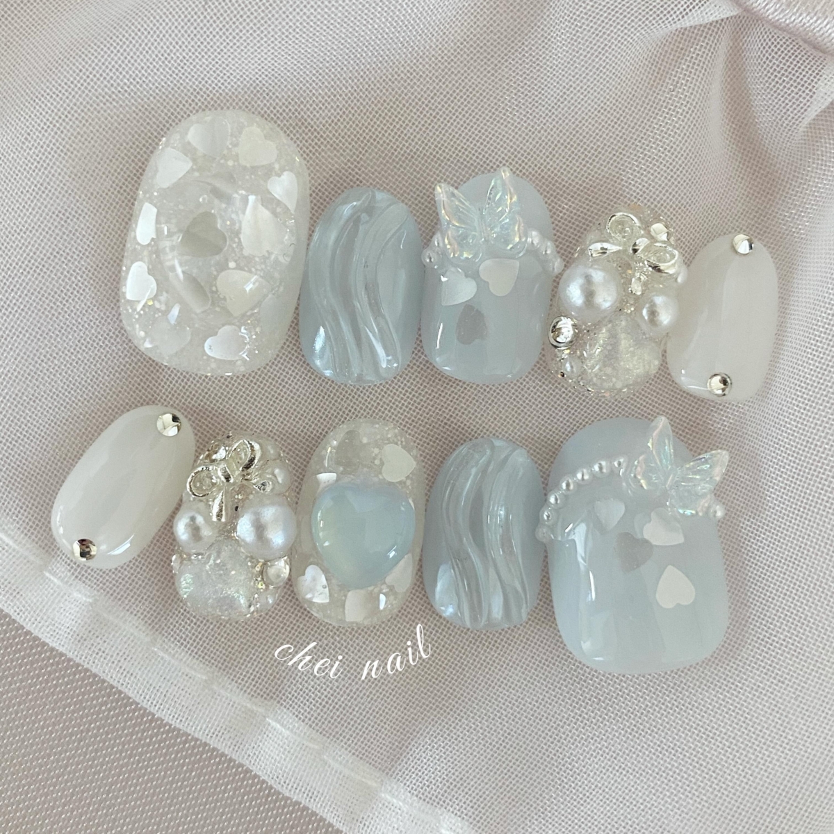 如果喜歡蝴蝶的朋友一定不能錯過這款美甲,以薄薄的冰藍色及白色做底色,然後用心心模樣的閃片、珍珠及蝴蝶結做裝飾,最特別是蝴蝶裝飾,令到指甲的款式更精緻又好看~