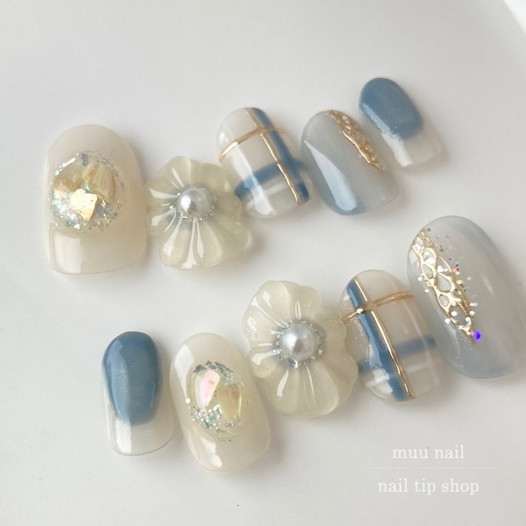 美甲款式2024|10款夏日冰透藍美甲範本!夢幻海洋風/日系立體花花/氣質珍珠款~