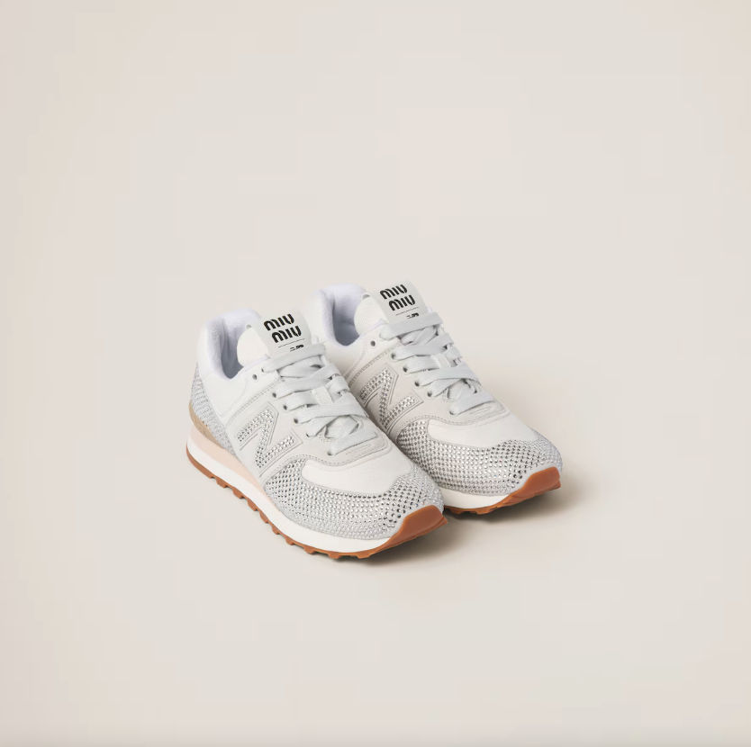 這款麂皮拼牛仔布聯名波鞋結合了New Balance的舒適感與Miu Miu的高級時裝元素,重新演繹了New Balance經典574款式。運用了頂級皮革和細緻做工,讓這雙波鞋不僅實用,閃鑽設計令鞋子充滿奢華感。