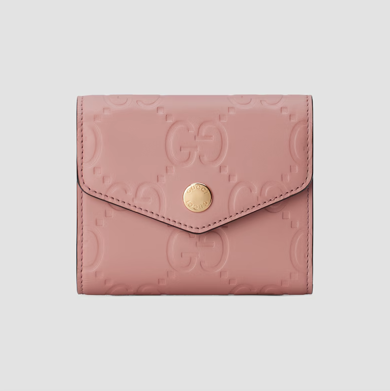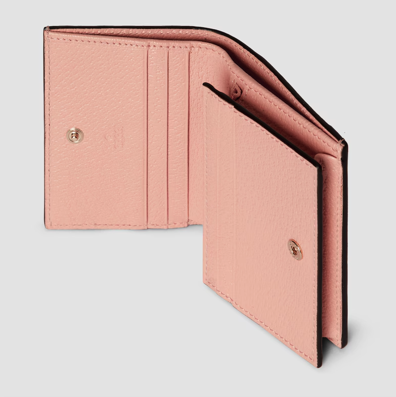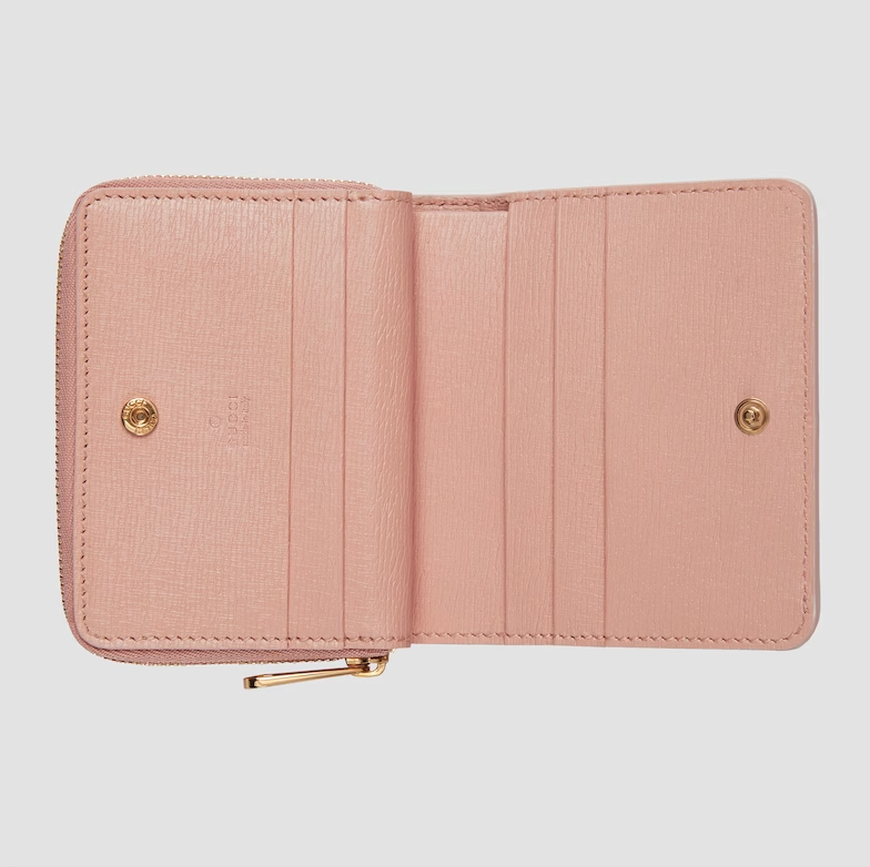 這款迷你銀包以淺粉紅色皮革製成,並以金色呈現Gucci手稿標誌細節,而且輕巧便攜,非常適合愛用小廢包的女生。