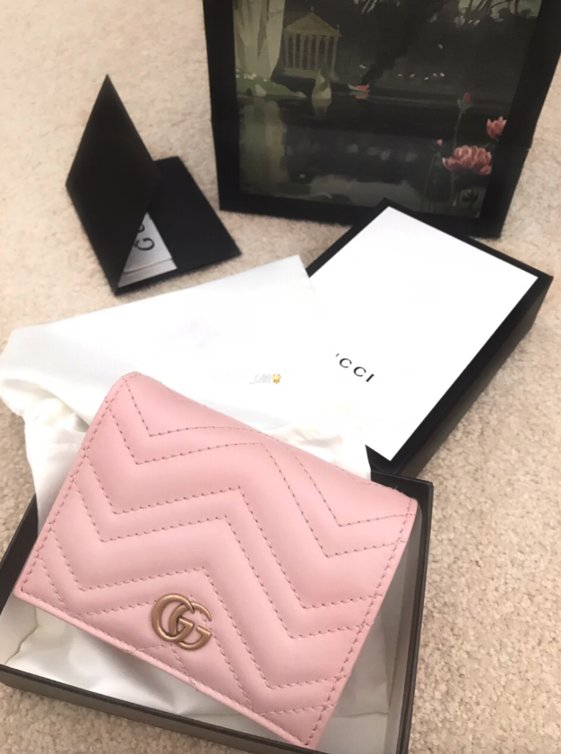 Gucci 淺粉紅色皮革GG MARMONT絎縫卡片套銀包採用粉紅色絎縫V形圖案皮革製作,綴以同色雙G鈀金配件。此款包含5個卡槽、鈔票隔及硬幣位,結合了優雅與實用。