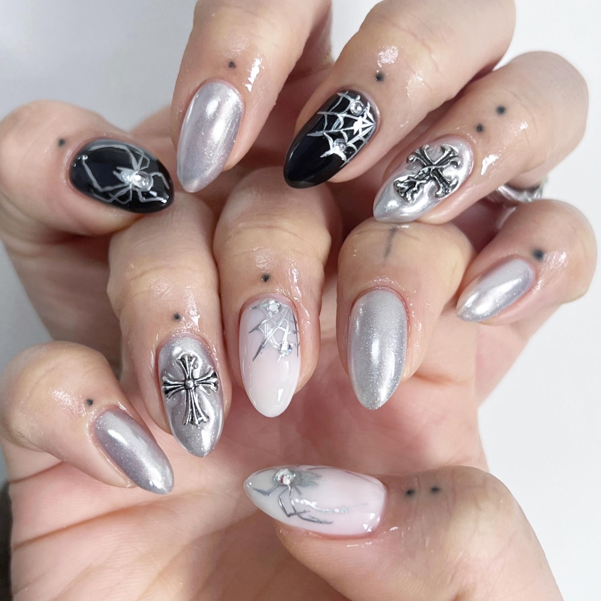 ESTJ的人外向又善於交際,他們有著優秀的領導能力,一些霸氣型格美甲款式都會好適合她們。不妨嘗試近年流行的大膽Y2K風,以型格風黑銀配色,配搭的手繪蜘蛛及十字花裝飾~