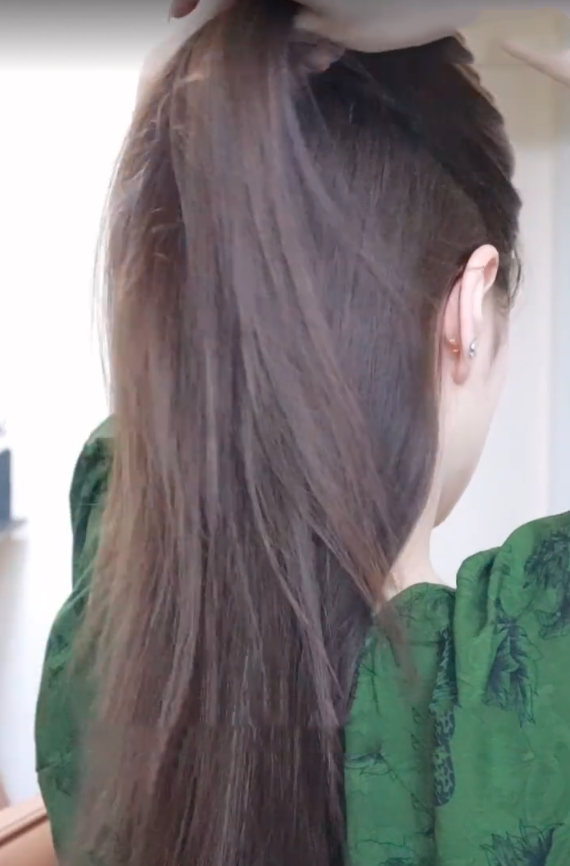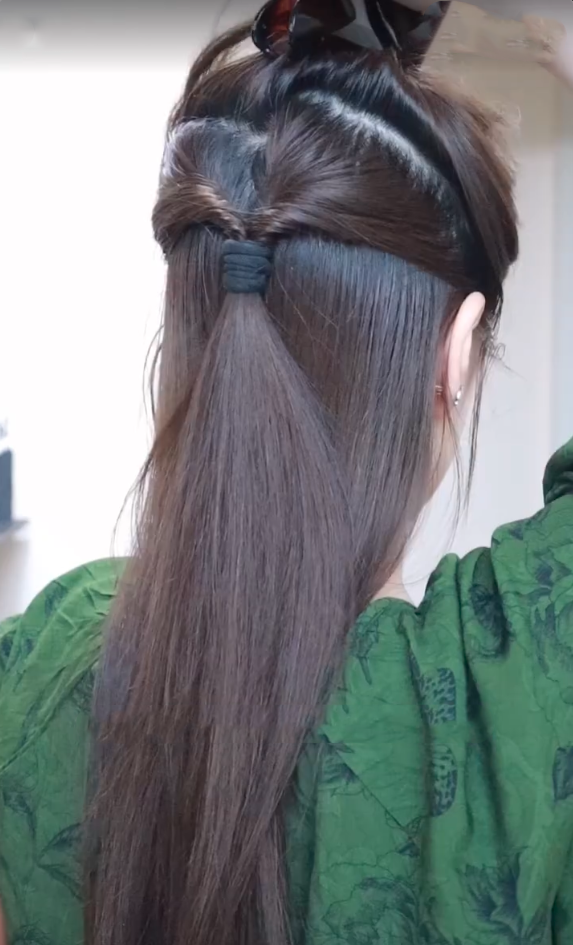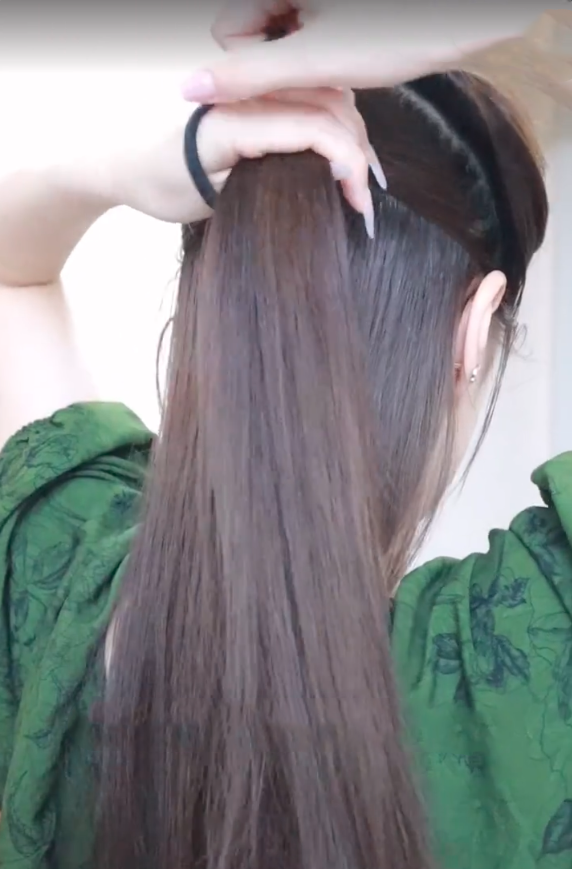 首先,準備一條稍微比較粗一點的橡筋,確保橡筋不會太緊或者太鬆,以免影響效果。接著,把頭髮梳理整齊,確保沒有打結。之後從兩隻耳朵斜上方取出一小量頭髮,並夾在上方備用。