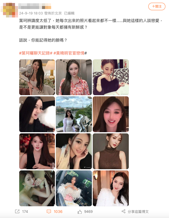 內地男星黃曉明與前妻Angelababy(楊穎)離婚兩年後,感情生活一直備受關注,早前他終於認愛32歲網紅葉珂,甚至傳出兩人結婚懷孕的傳聞。近日有網友翻出葉珂的舊照,不但狠批辨識度太低,每張照片看起來都不一樣,當中與疑似與前夫的結婚相,甚至令網友驚呼:「這真是同一人嗎?」