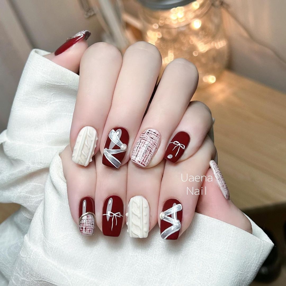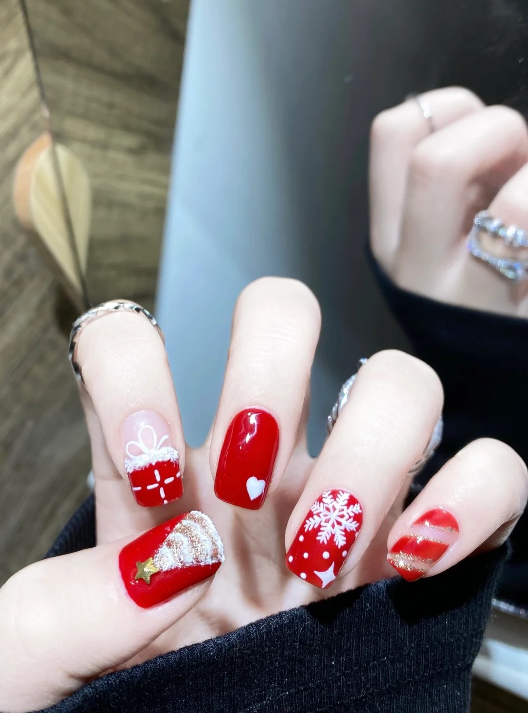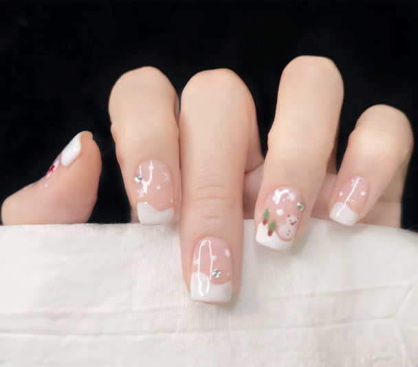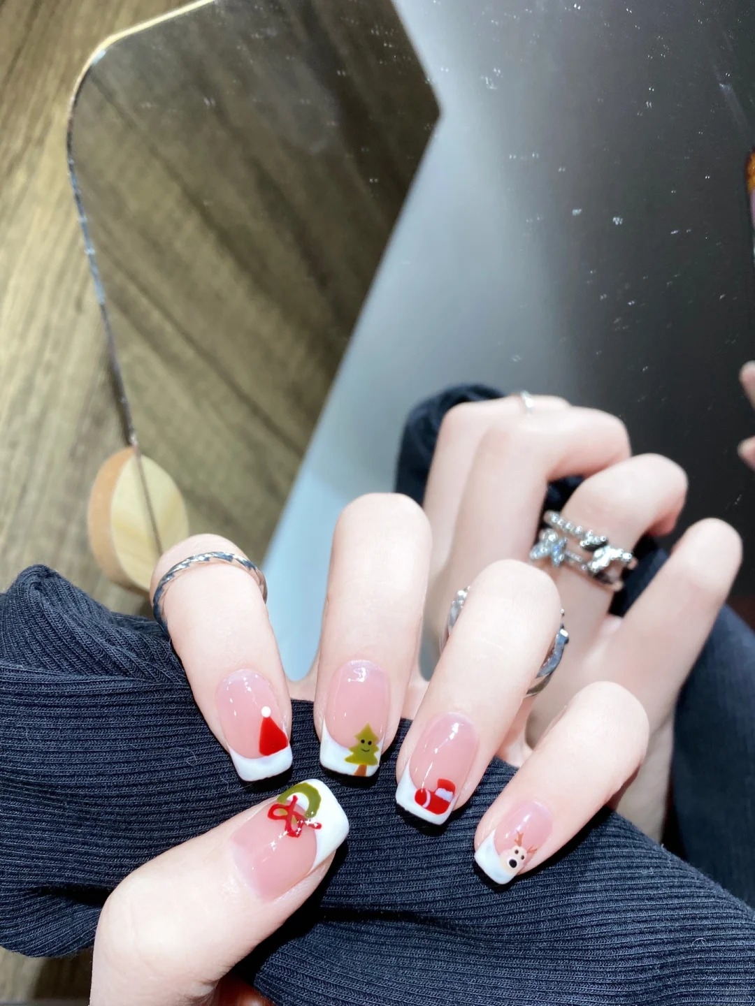 將傳統的法式美甲與聖誕元素結合。以經典紅白色為基調,加上小小的聖誕圖案,增添了幾分俏皮與可愛。