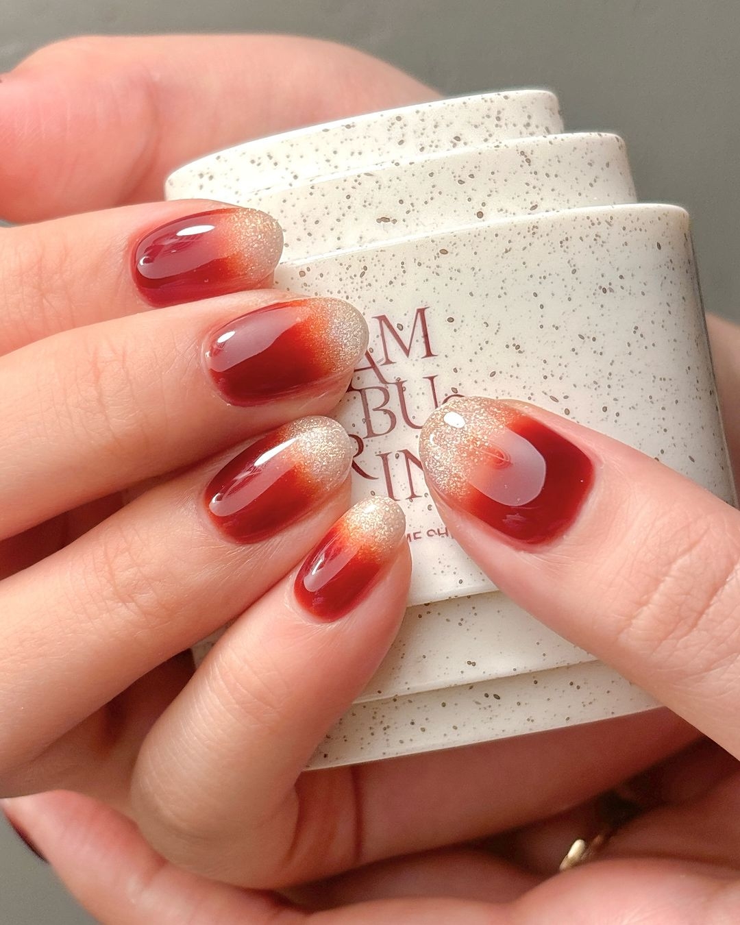 紅色系美甲能提升整體氣質,還有顯白效果。 搭配金色或銀色的閃粉,讓指尖如同聖誕燈飾般璀璨奪目。