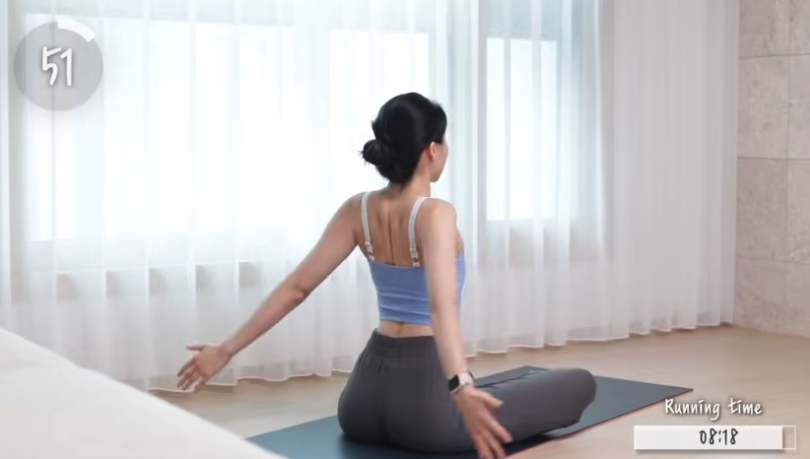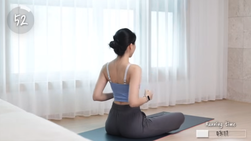 第三個動作是雙臂向後伸展,先將雙臂彎曲掌心向下,然後用背部發力向後伸展,坐姿要保持挺直。
