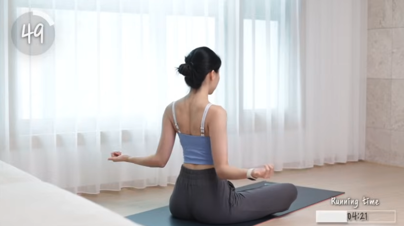 第一個動作是雙手抱頭擴胸,先將雙手放在兩邊耳上,吸氣時雙臂向外擴展,吐氣時屈起,在打開肩膀時要感受到肩胛骨肌肉的伸展。