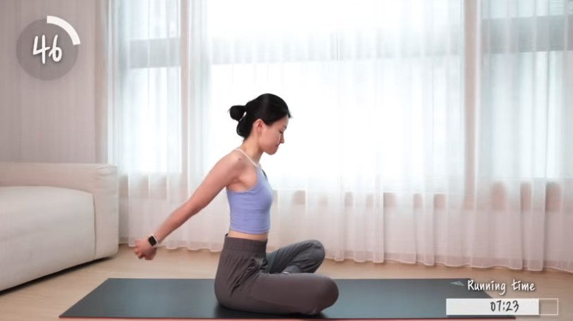 第七個動作是背部肌肉拉伸,先將雙臂打開伸展,然後用力夾緊肩胛骨~