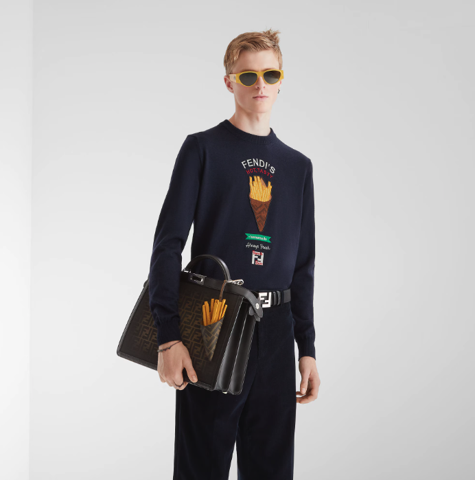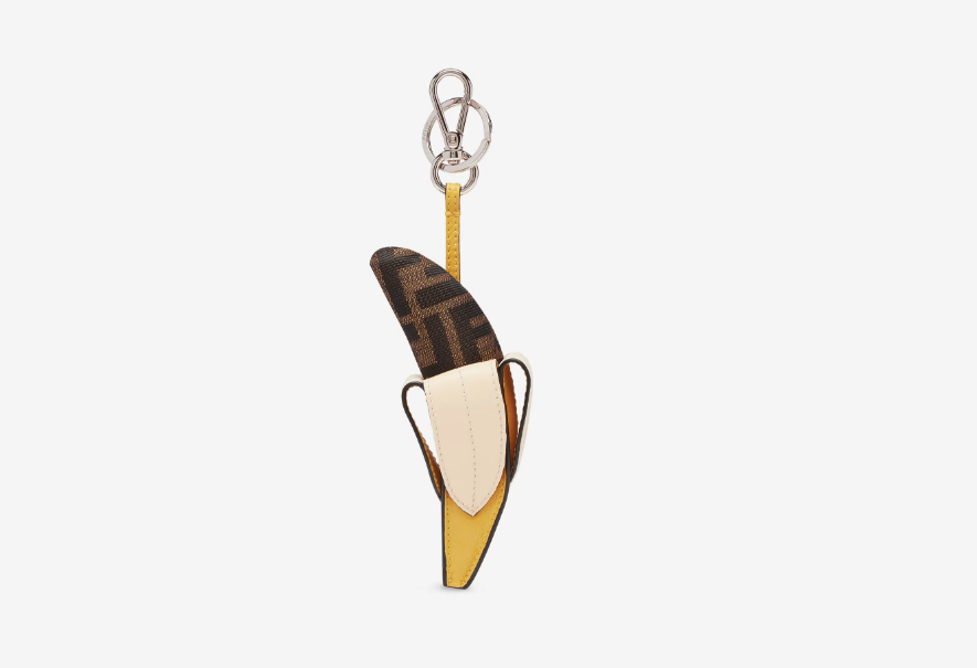FENDI推出的2024年冬季聖誕節系列「Fendilicious」男士單品以食物為主題,除了有一系列的手 袋、Card Holder及服裝外,最吸睛的莫過於是超可愛的手袋吊飾~當中有看上去薯條、壽司、熱狗及Pizza造型手袋吊飾,又有一款香蕉模樣的棕色FF提花和皮革鑰匙圈,售價為HK$5100。
