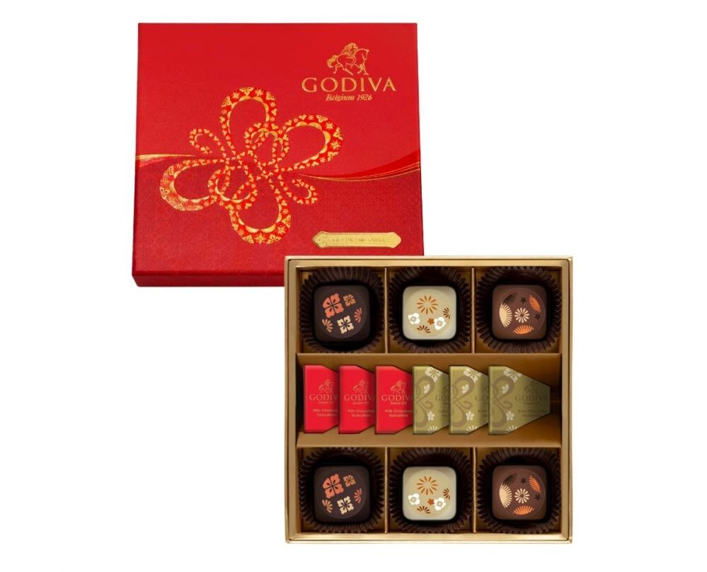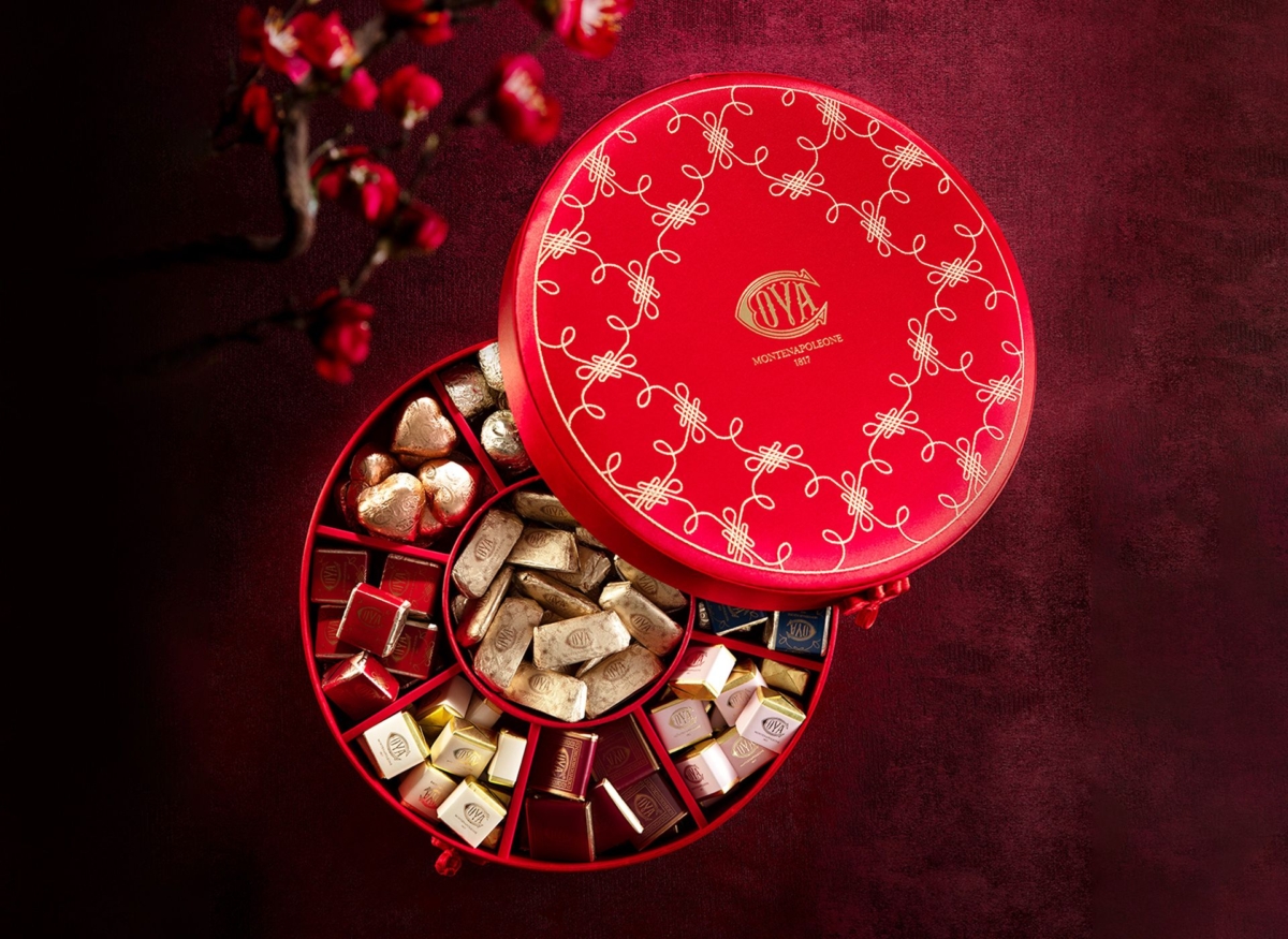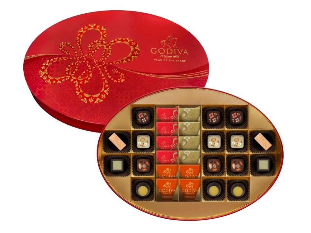 「新年巧克力鐵盒28顆裝」和「新年巧克力禮盒12顆裝」內含的巧克力口味相同,都是經過精心打造的風味。禮盒結合了中國傳統元素與西方巧克力藝術的創新手法。外觀以蜿蜒靈蛇的中國繩結設計,搭配紅、金色調,象徵著新年的吉祥喜氣。