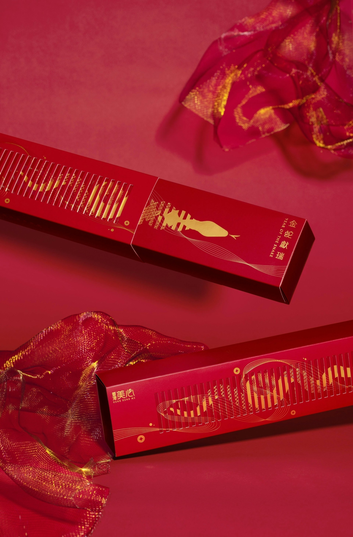 「鋪鋪發酥餅禮盒 + 招招財酥餅禮盒 + 金蛇獻瑞禮盒」,設計靈感來自麻雀中象徵好運的「發財」牌,內含原味甜心酥及牛油曲奇或榛子曲奇及一口原味杏仁條。另外,還有牛油香濃撲鼻的原味雞蛋卷禮盒「金蛇獻瑞禮盒裝」,禮盒以紅色設計,喜迎蛇年。