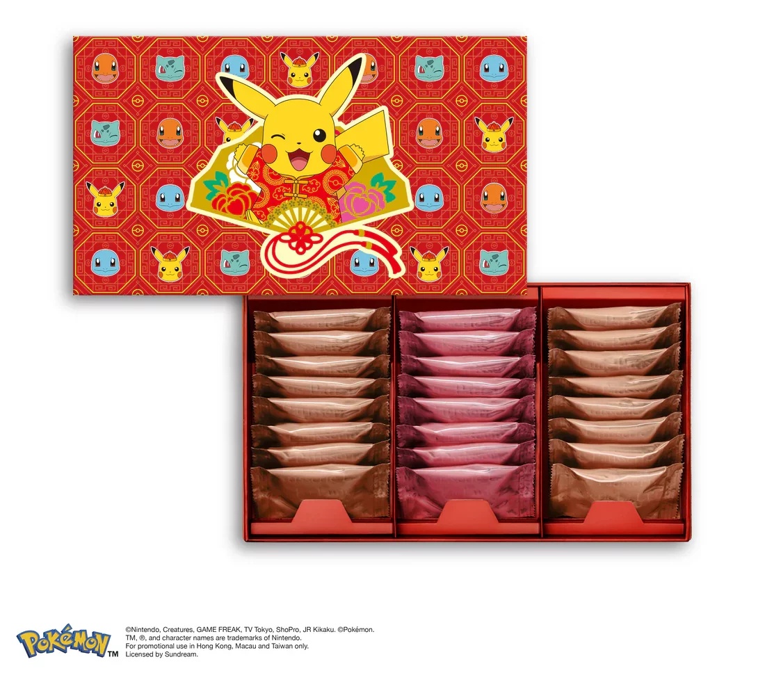 望月特別推出的全新「Pokémon雜錦新年禮盒」,外包裝印有多隻人氣Pokémon角色,搭配喜慶的紅色背景,增添節日的氛圍。禮盒內包含三款精緻美味的點心:望月經典蝴蝶酥、伯爵曲奇和朱古力曲奇,以滿足不同人士的口味與喜好。