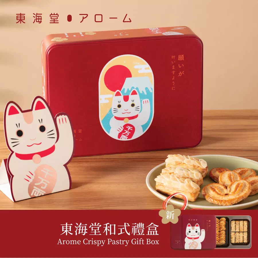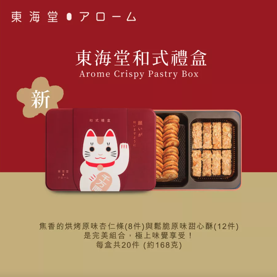 「和式禮盒」內有原味甜心酥及原味杏仁條,焦香的烘烤杏仁片與鬆脆甜心酥是完美組合,極上味覺享受,讓人感到幸福的小甜點。外包裝更可摺成開運招財貓立牌,帶來滿滿祝福!