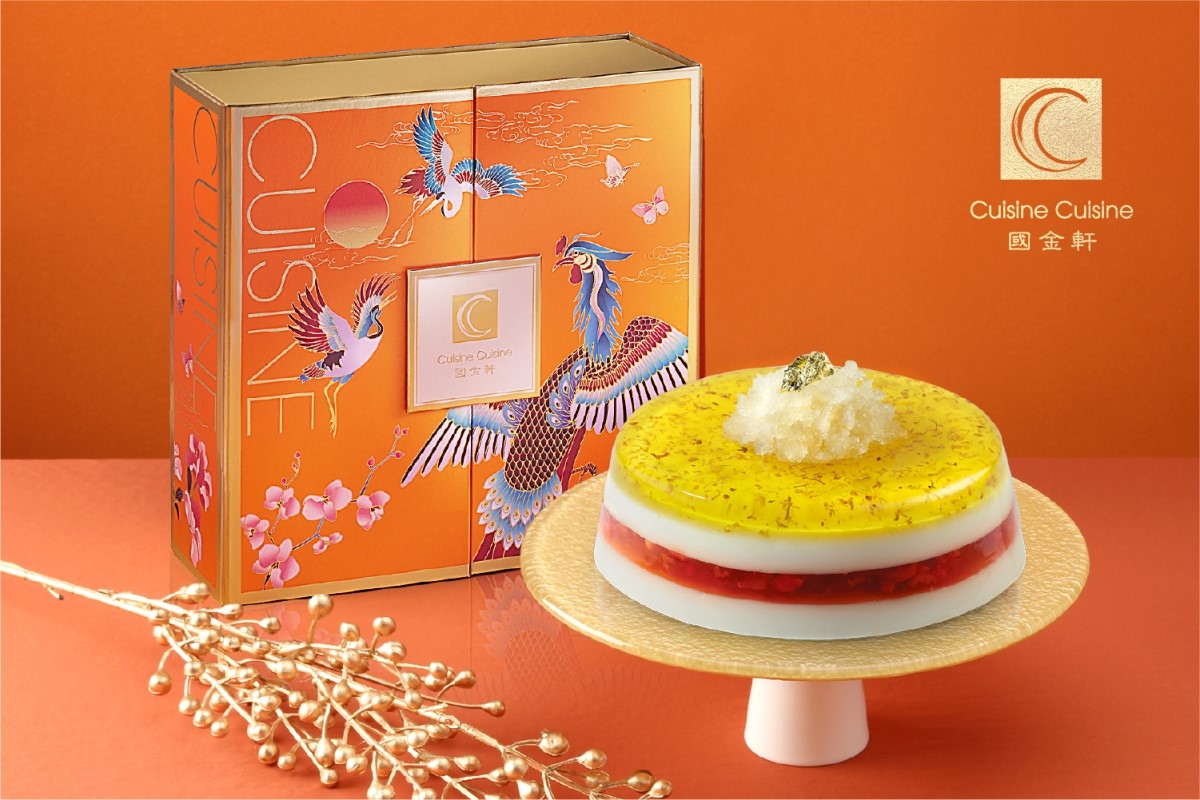 「國金軒金箔燕窩花香椰汁凍糕」將洛神花與玫瑰醬完美結合,打造出一種酸甜醒胃的滋味,並在口中綻放淡雅的花香。配搭金黃桂花糕及香滑椰汁糕更顯矜貴,是一道不可錯過的甜品選擇。