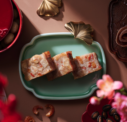 而「西班牙火腿臘味芋頭糕」嚴選泰國芋頭、風味臘味、泰國金勾蝦米。一口芋頭糕混和西班牙火腿的鹹香、瑤柱蝦米的鮮味、臘味的鹹香、芋頭的乾鬆,綿密口感與豐富味道相互緊扣。